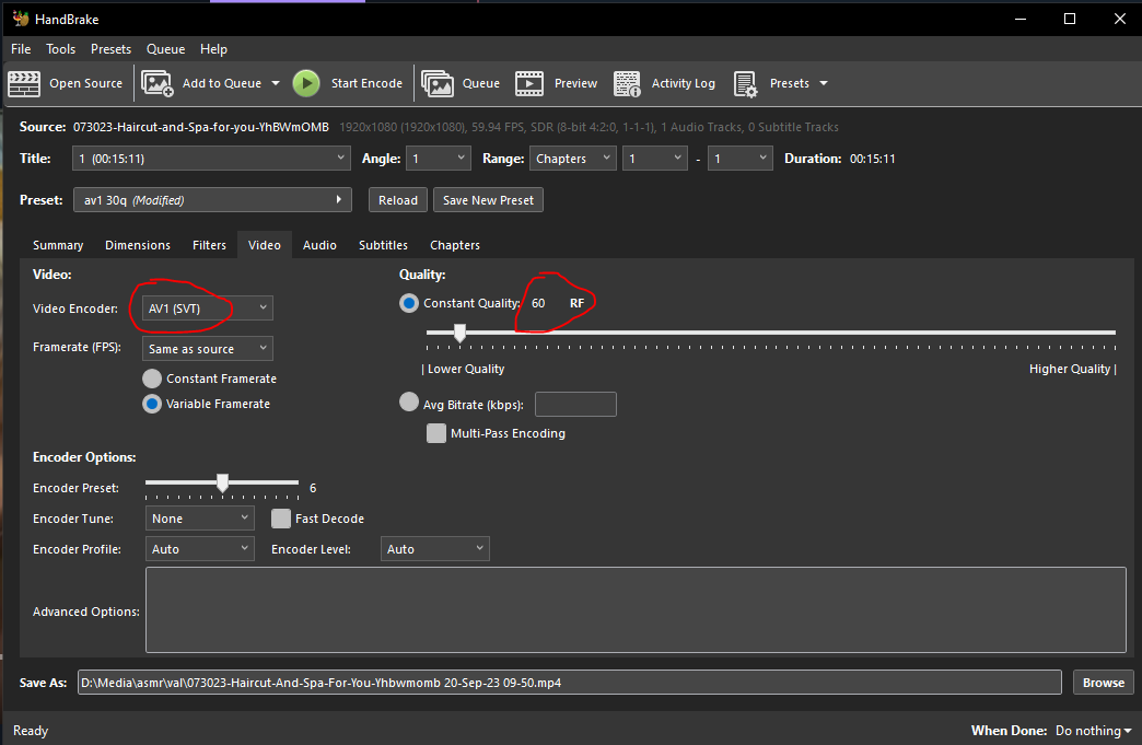 главное тут AV1 кодек и шакальное качество 60 (чем больше число, тем хуже качество), а битрейт он сам подбирает, чтобы соответствовать уровню