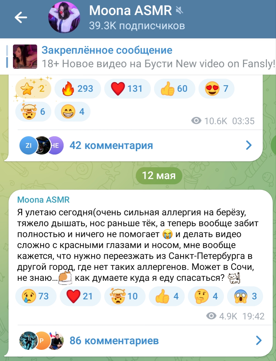 >>198429 Муна тут не причём. Прикрылась аллергией, а сама скорее всего куда-то с мужем уехала чилить, она уже так делала и не раз. Но тут скорее всего вернётся уже не скоро, возможно ближе к осени.