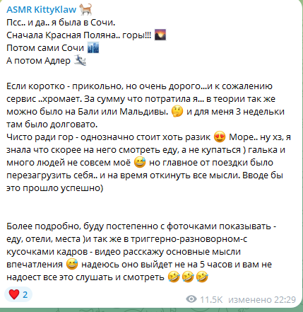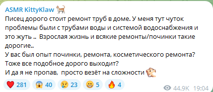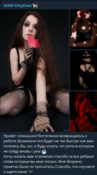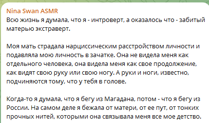 - переписывается с мужиками находясь в россии с американцами (русские мужики ей на хуй не сдались естественно) - летать в россию к врачам - снимать жильё в москве - ждёт ремонта в своей хате в москве и видимо сдаёт квартиру которую купила во владике + своё дом у неё пустает два три месяца (до этогоговорила ремонт делают там ей), а щас кто там живёт у неё, видимо сдаёт также (полагаю сдача недвижки это её и ессть работа где она упахалась вся остоянно) ибо она постоянно в телеге хуйню высирает и никем она не работает нигде, бывшая фотомодель и бывшая эскортница просирающая деньги которые накопила - по итогу на асмр она забила на личную жизнь тоже и уже сама не понимает кто она где она исходя из бредовых кружоччков что пуутает уже какой год (да я смотрю её кружочки ещё) - но самый прикол, геля реально пеерстала ей писать, после слива её сообщений на двач (это забавно конечно, как она боится всего и скрывает всё)