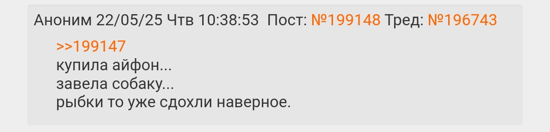 >>197717 >завела рыбок Ебанутое создание, за ними нужен уход в разы больше, сложнее и внимательнее, чем ее сраные кошки. Рыбок жаль. Либо у такой хозяйки сами сдохнут, либо коты сожрут.