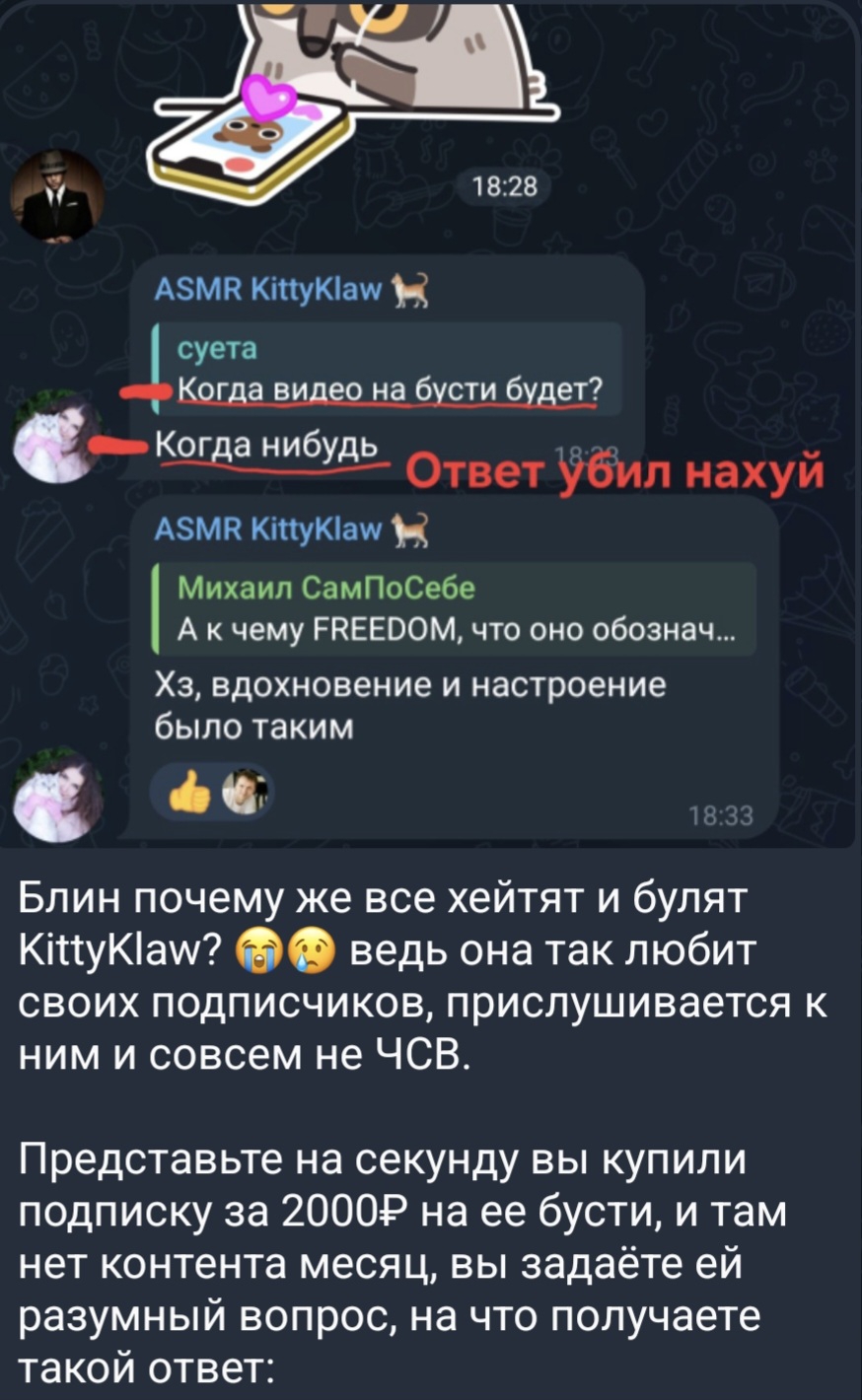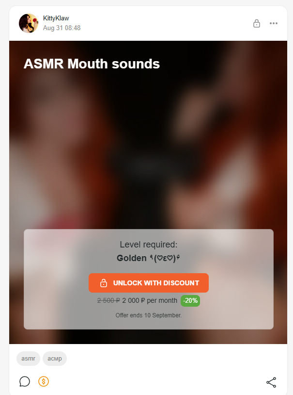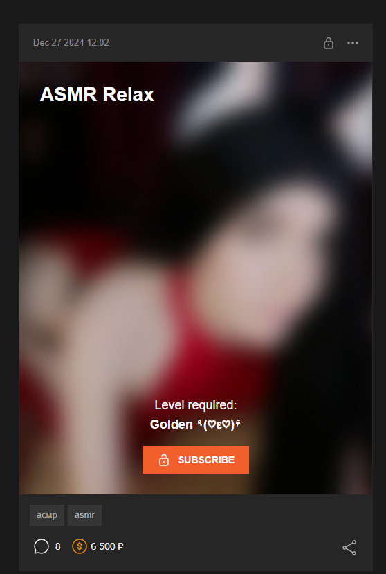 то есть основное зачем люди подписываются - хот асмр не получают. с таким отношением понятно почему никто не хочет платить наёбщице и те кто по дурости заплатили в разочаровании сразу же сливают её контент