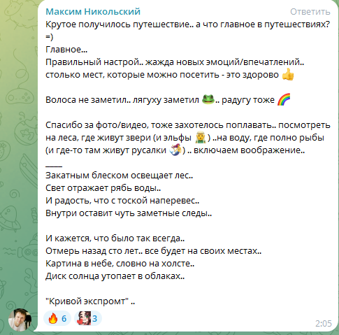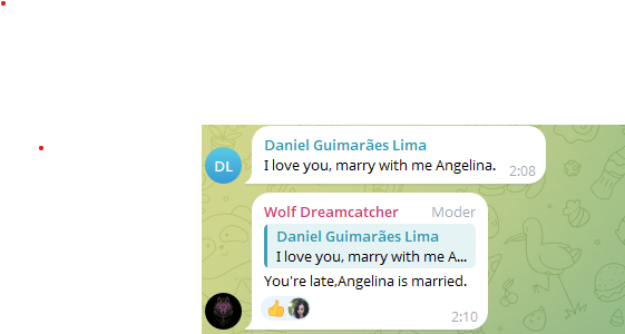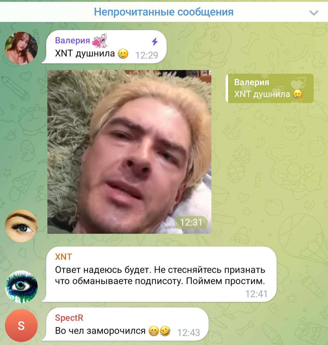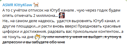 Пиздец если кто то пишет или упоминает хотя бы что Геля замужем, стираются сообщения или вообще наверное в бан улитают, а тут симп далбаёб спокойно пишет об этом, и ни хуя норм. Гелька уже поплатилась своим видео про то что живёт с мужем, столько донатеров-подписчиков отвалилось что пиздец, и просмотры упали в несколько раз, видать этот симп далбаёб хочет повторения, отписки, упадок в просмотрах - Браво, ещё и модерку ему дала в телеге хах.