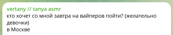 Для тех, кто хотел встретиться с танюшей, у вас появилась долгожданная возможность. Сфоткаться не забудьте (с вайперами). Правда встреча не совсем бесплатная. Зато можете получить персональный асмр (а может и не только его)