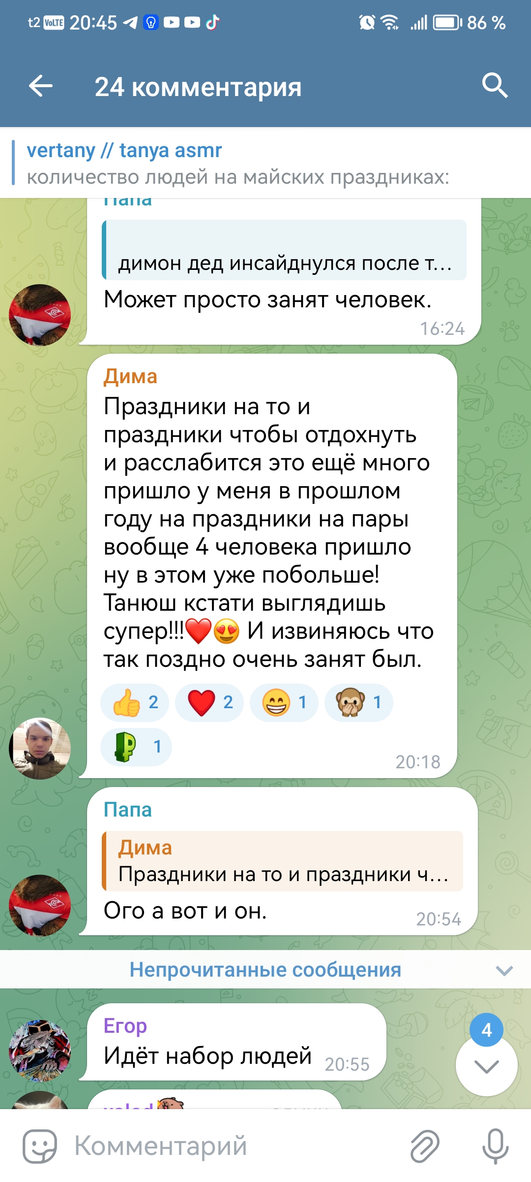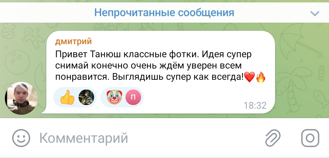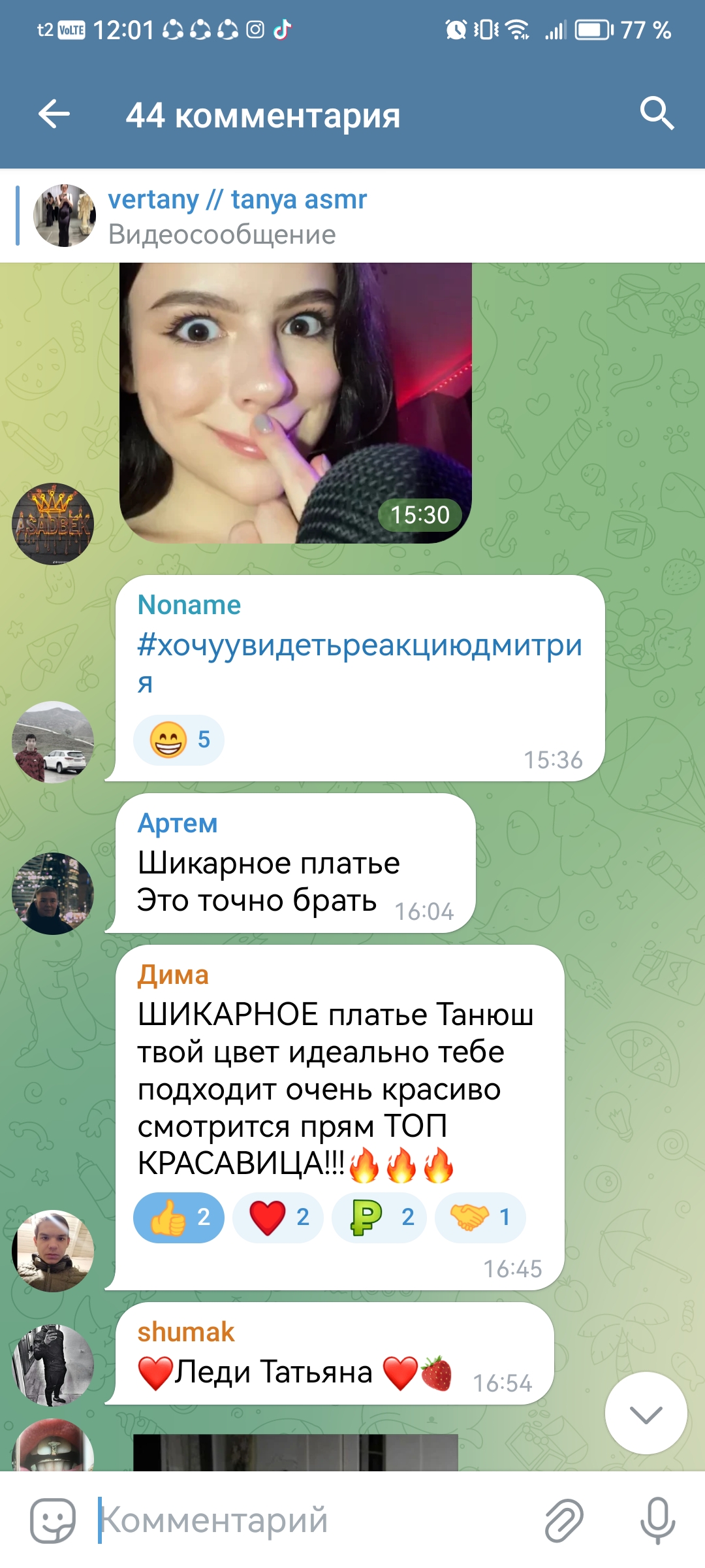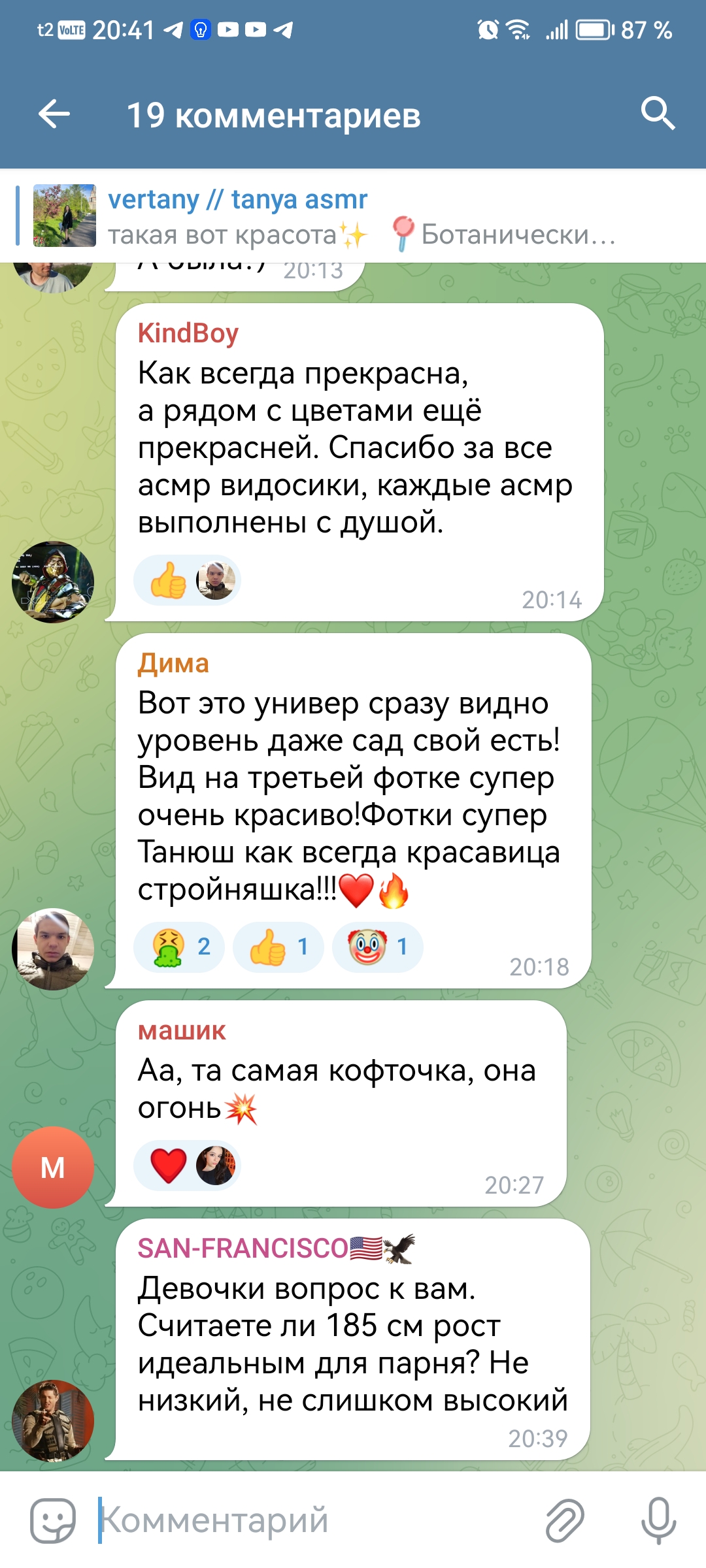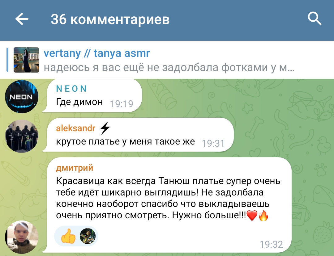 2. телеграм канал чтобы выёбываться комментарии чтобы обсуждать, то есть по логике этого человека надо тупо писать о вам охуеть Таня пиздец красивая и всё (и Таня и димка лайкнули - ну тогда закрой коммкнты7и ты донать ей вне стрима ёпта)