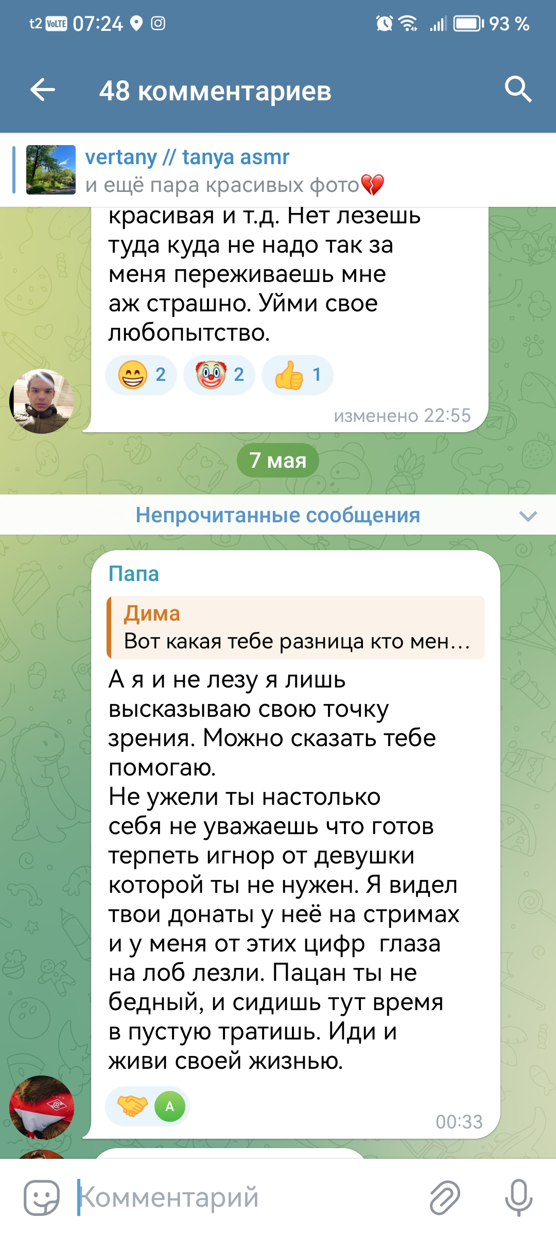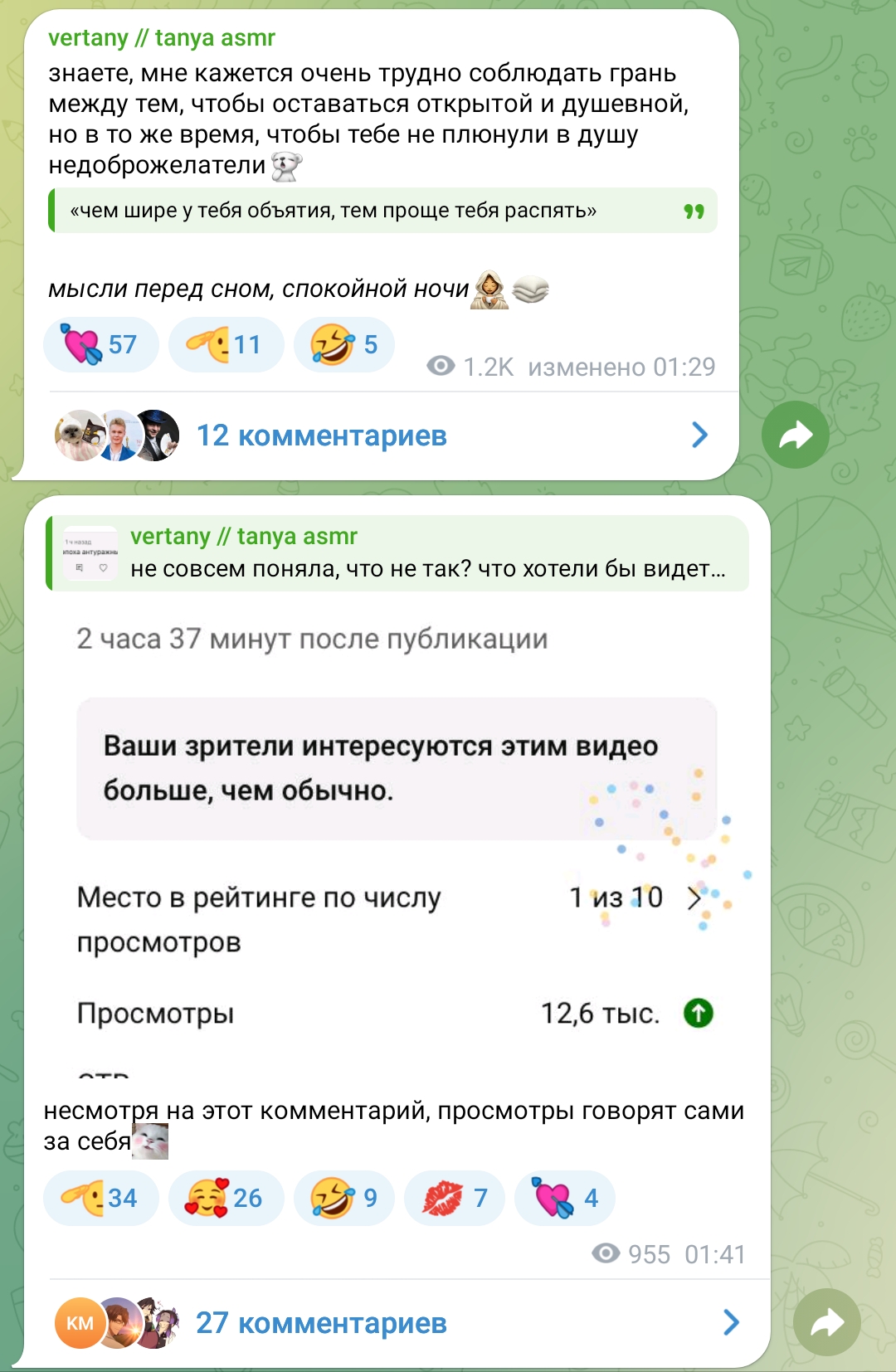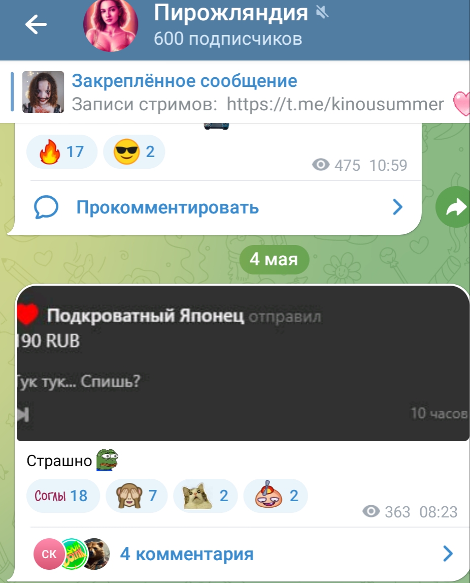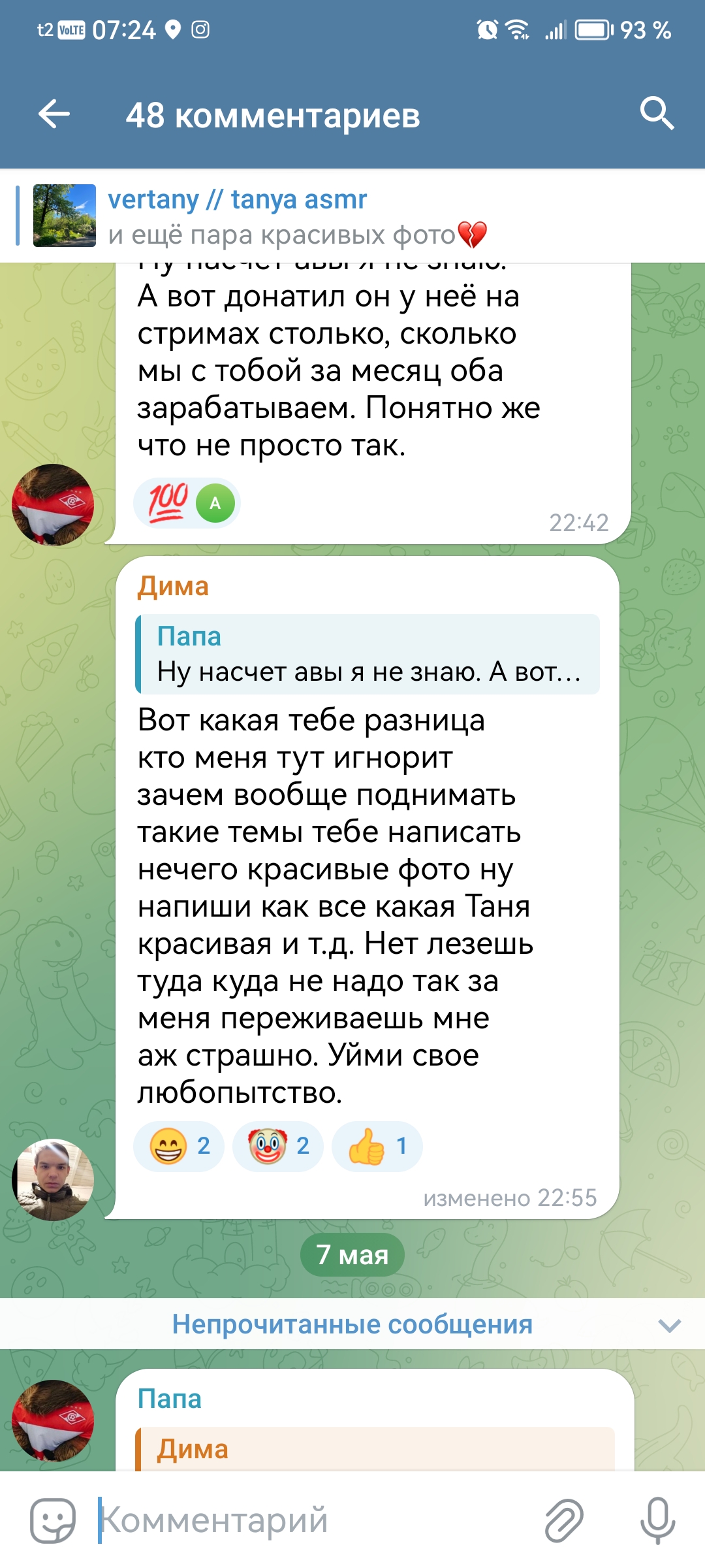 2. телеграм канал чтобы выёбываться комментарии чтобы обсуждать, то есть по логике этого человека надо тупо писать о вам охуеть Таня пиздец красивая и всё (и Таня и димка лайкнули - ну тогда закрой коммкнты7и ты донать ей вне стрима ёпта)