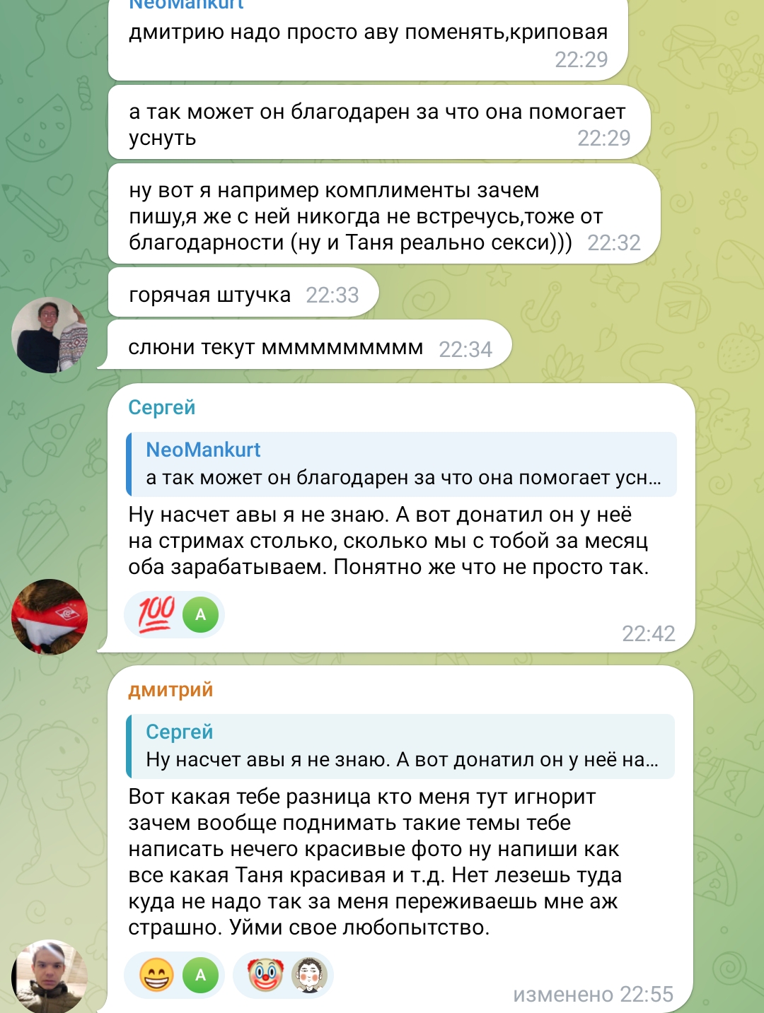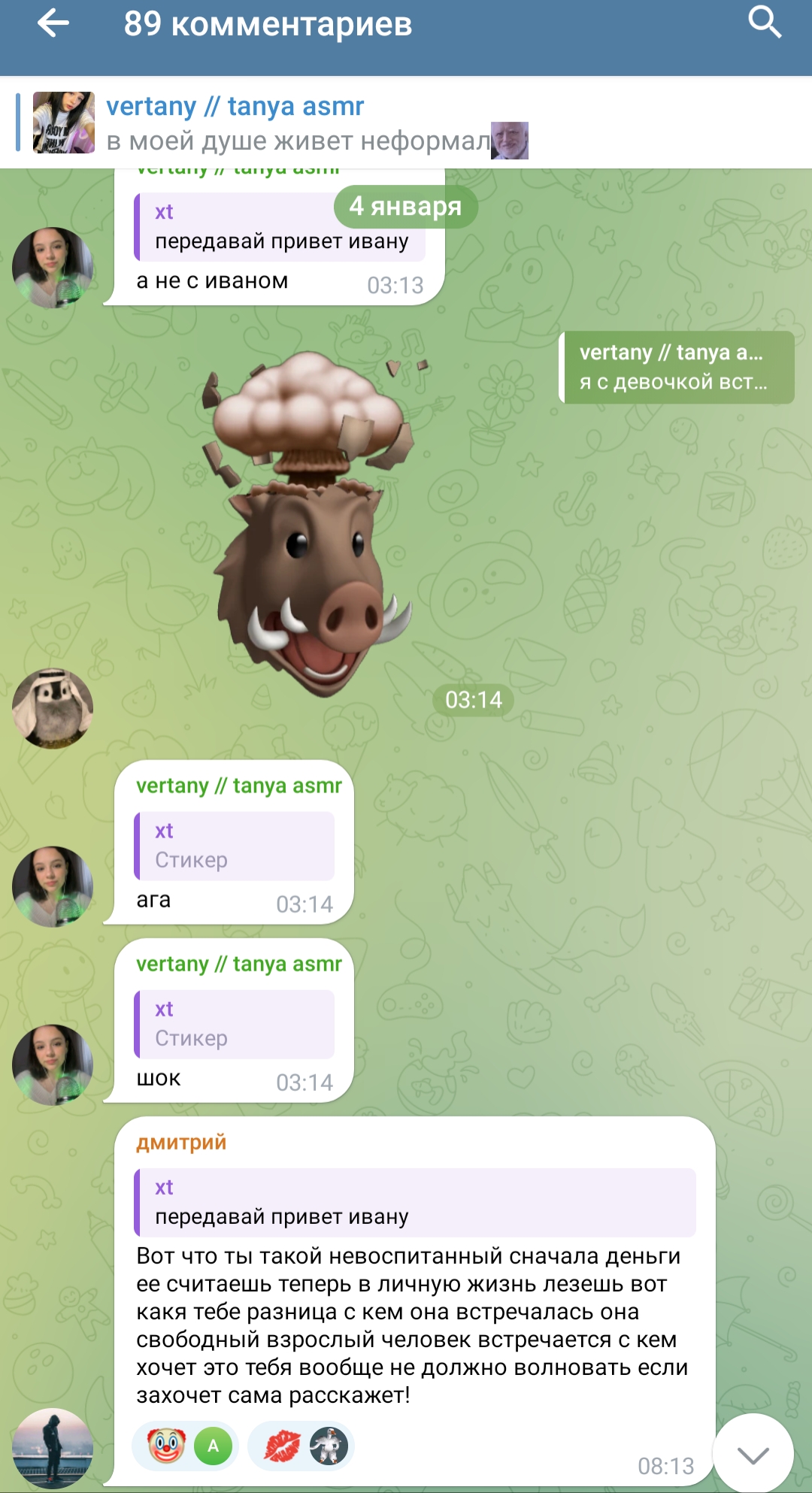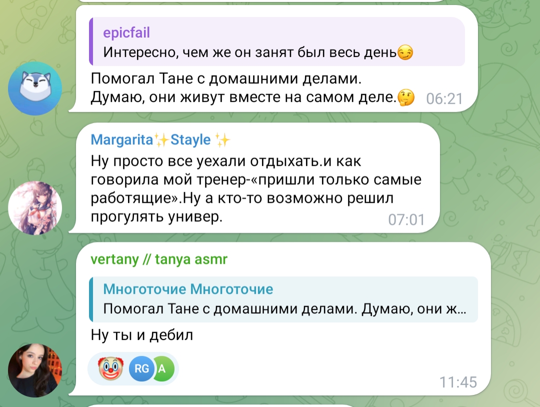 то что ты защищаешь её ёбырей, не означает что ты не клоун, это во первых во вторых она скрывает ёбырей чтобы в неё влюблялись и донатили (это часть её образа и работы) а ты либо молчи в след раз, либо или донать Тане подарками в личку в телегу канал, раз такой правильный бля