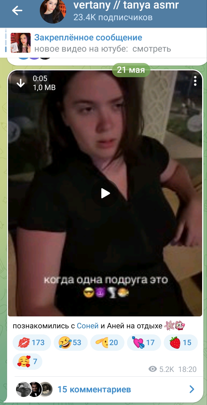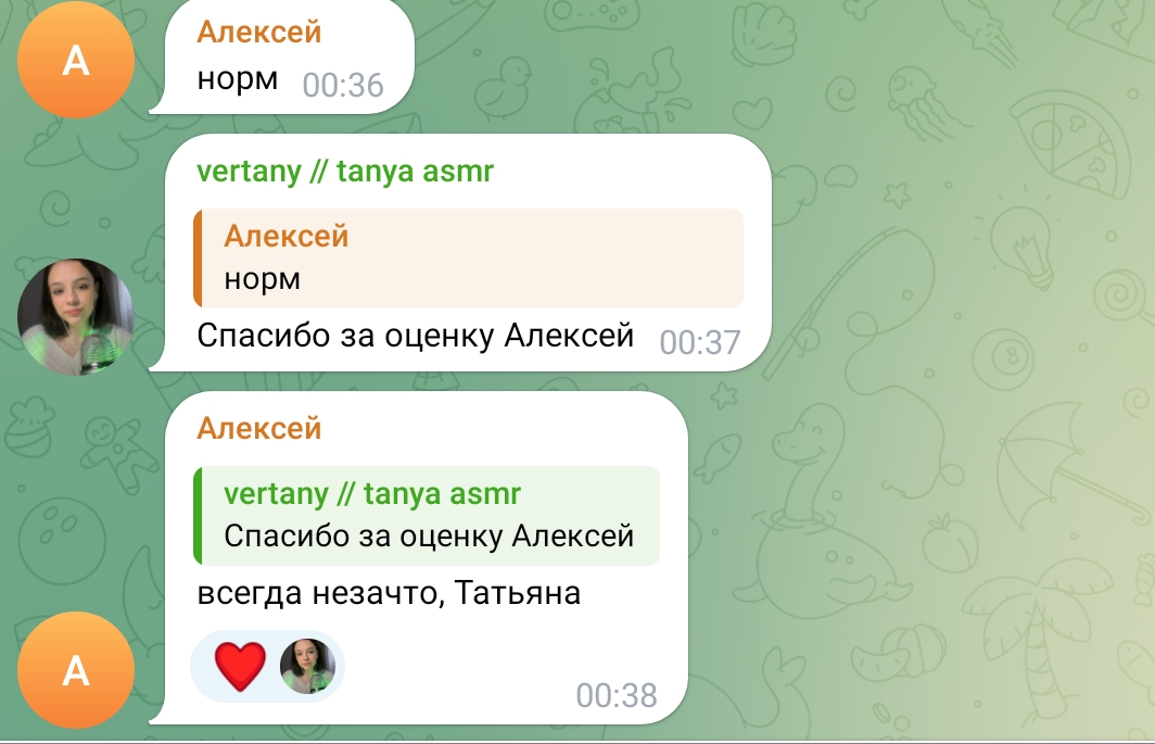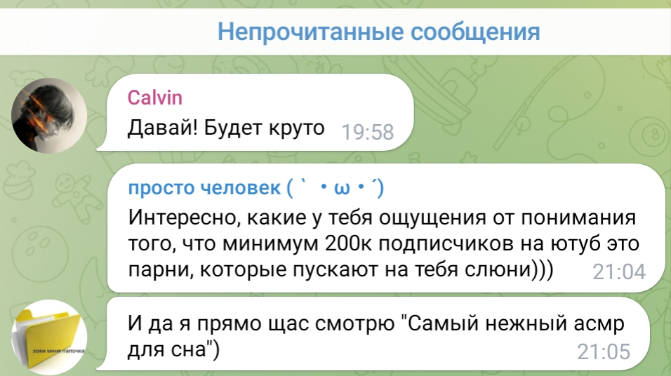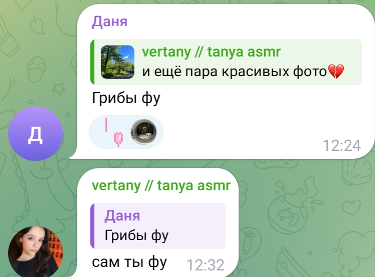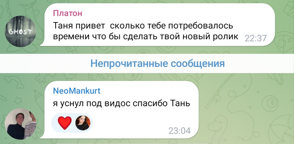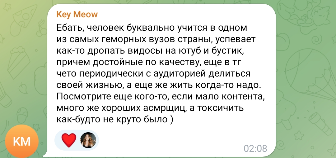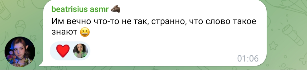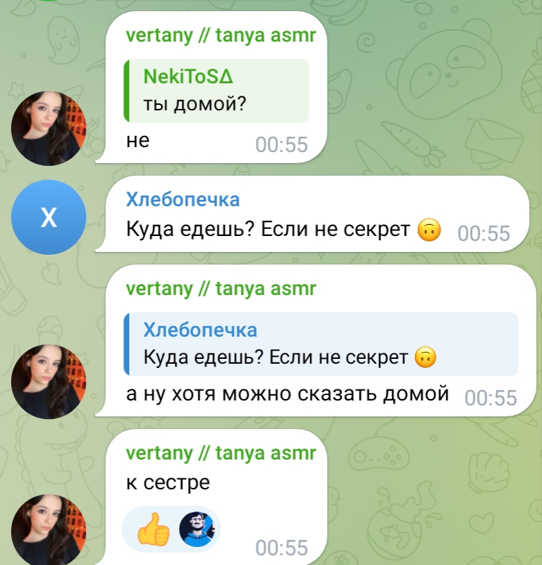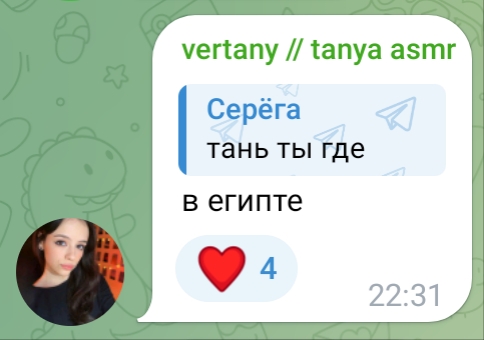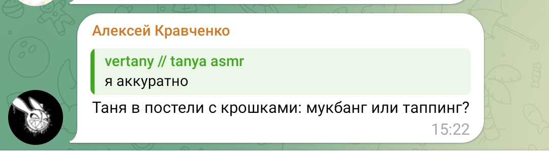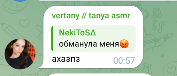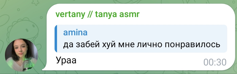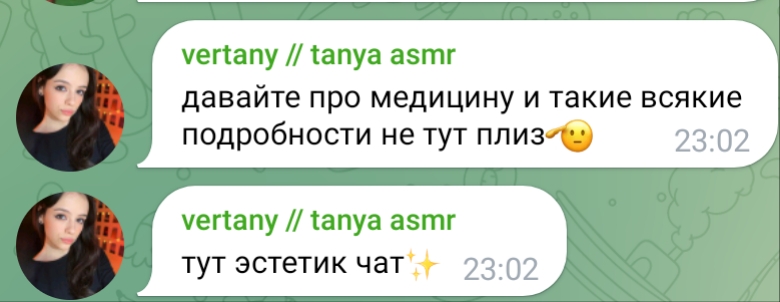ну а с другой стороны, танин асмр и телеграм канал её и сама Таня настолько безобидно существуют по сравнению с говном всяким из телеги той же что аж хочется ей задонатить.