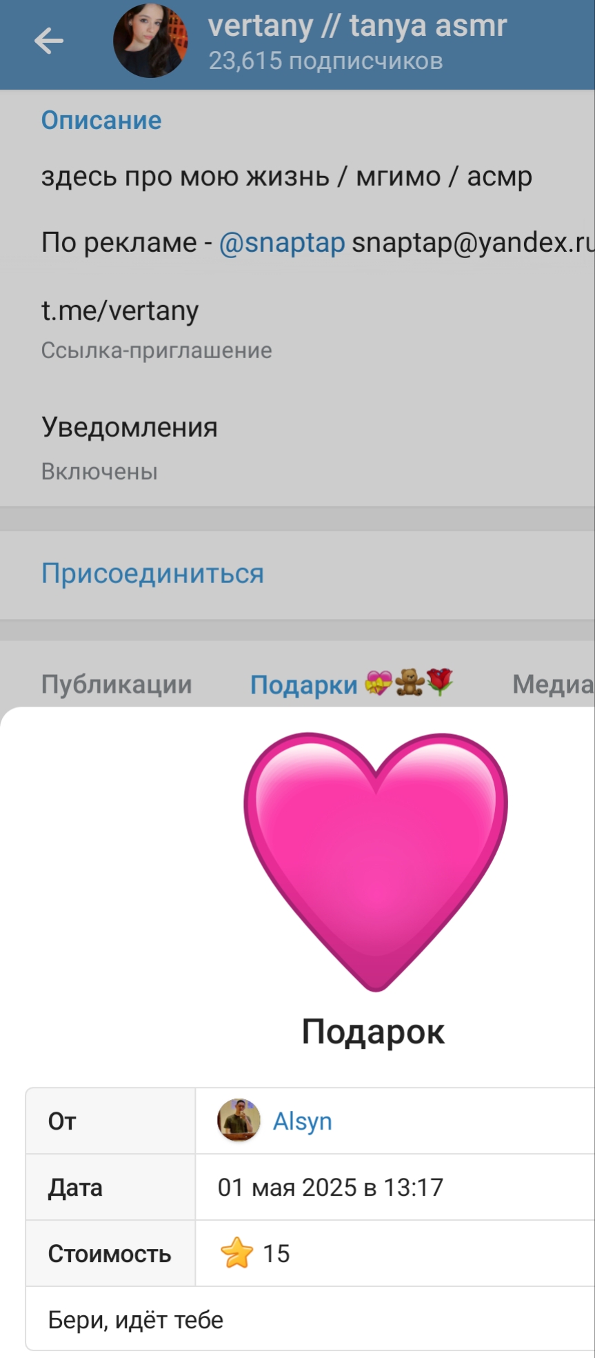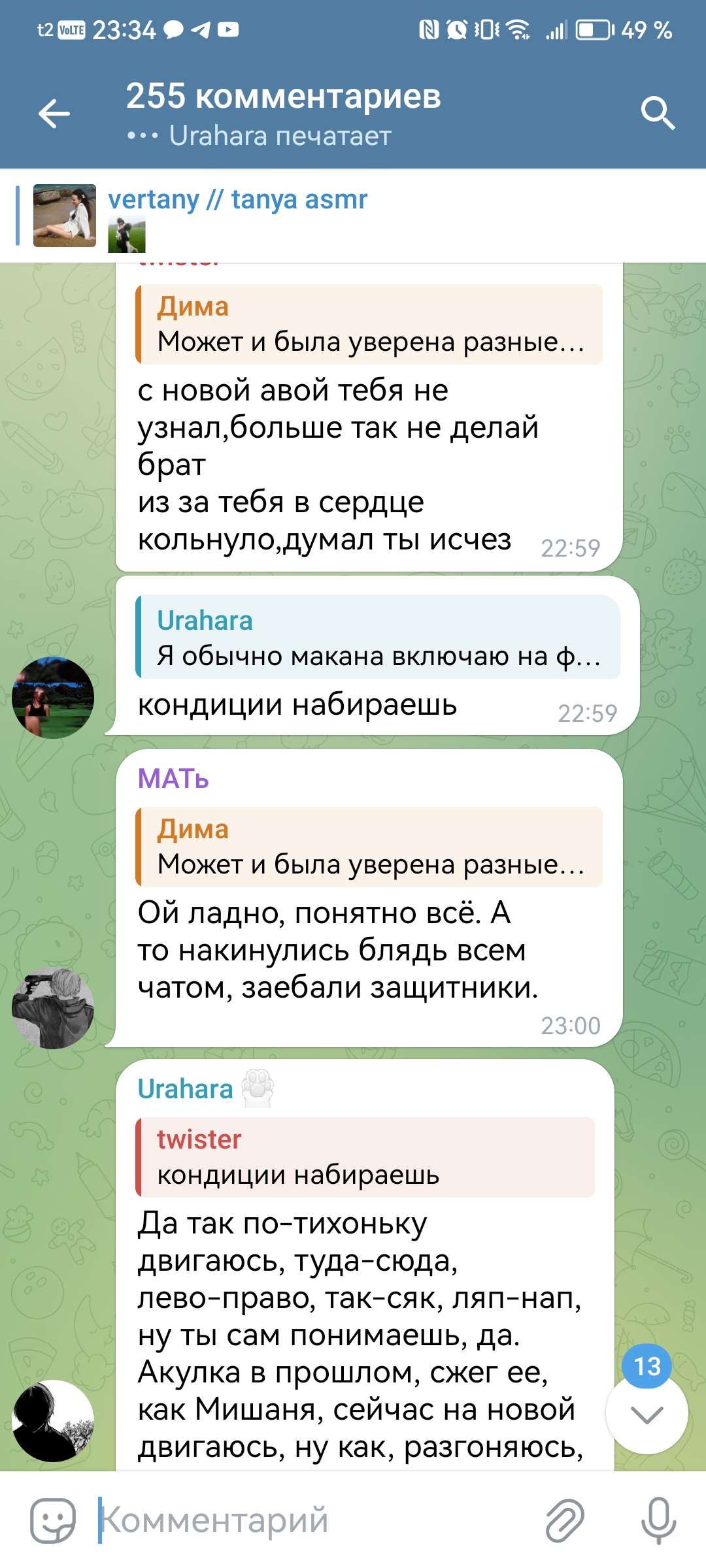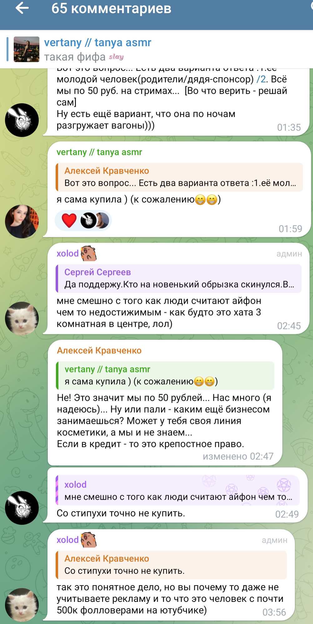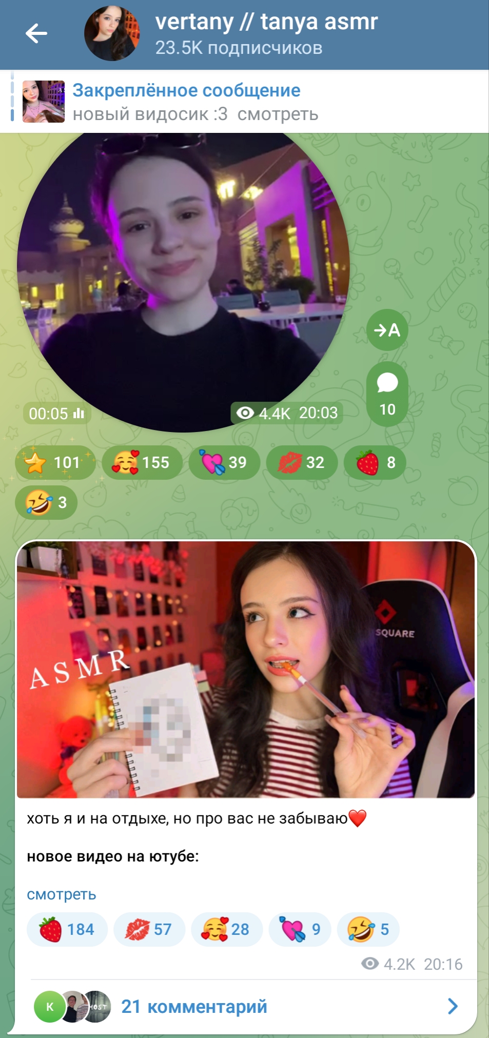 ну а с другой стороны, танин асмр и телеграм канал её и сама Таня настолько безобидно существуют по сравнению с говном всяким из телеги той же что аж хочется ей задонатить.
