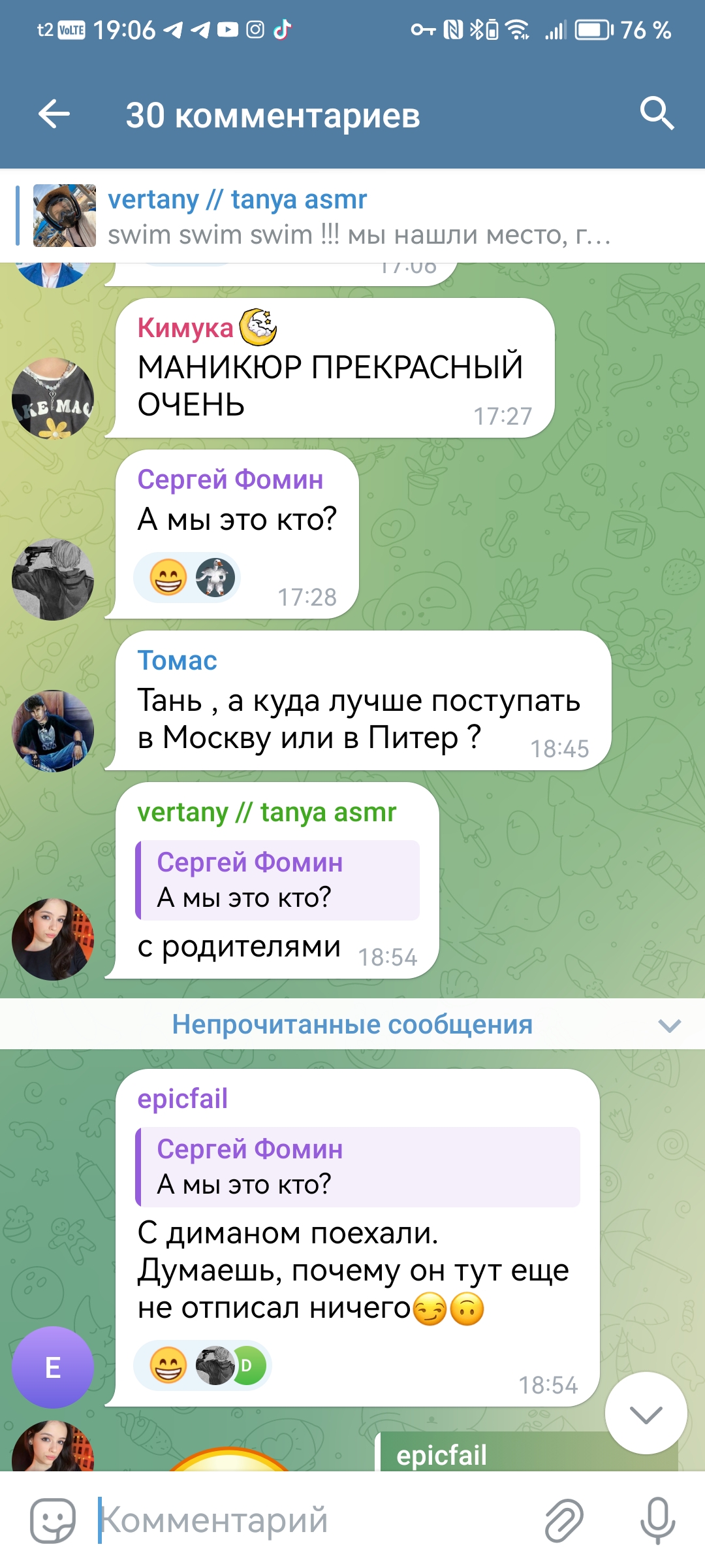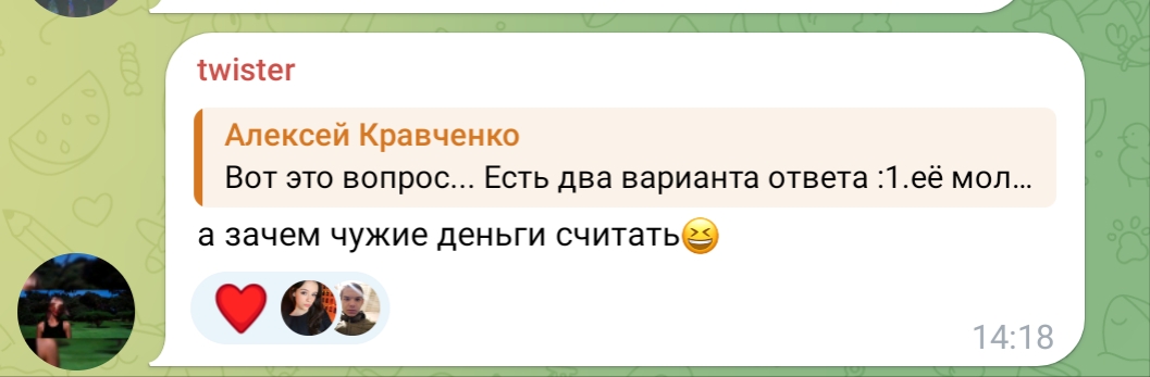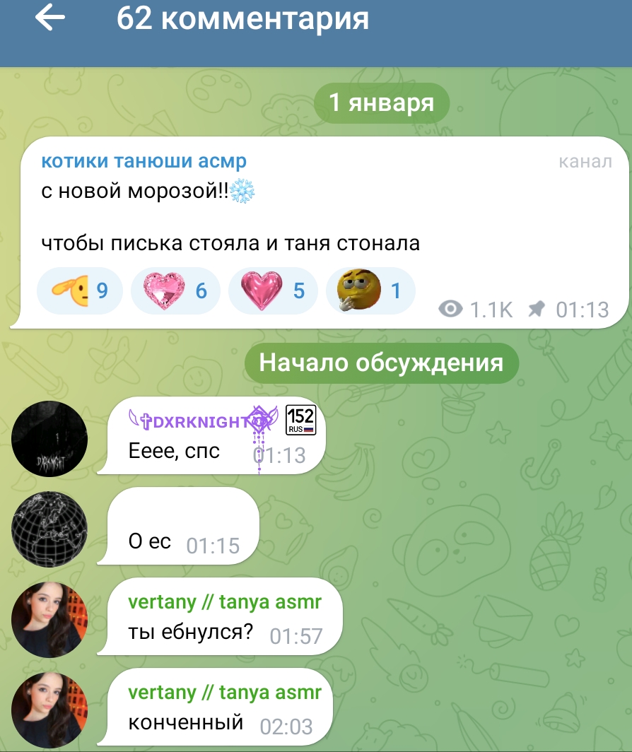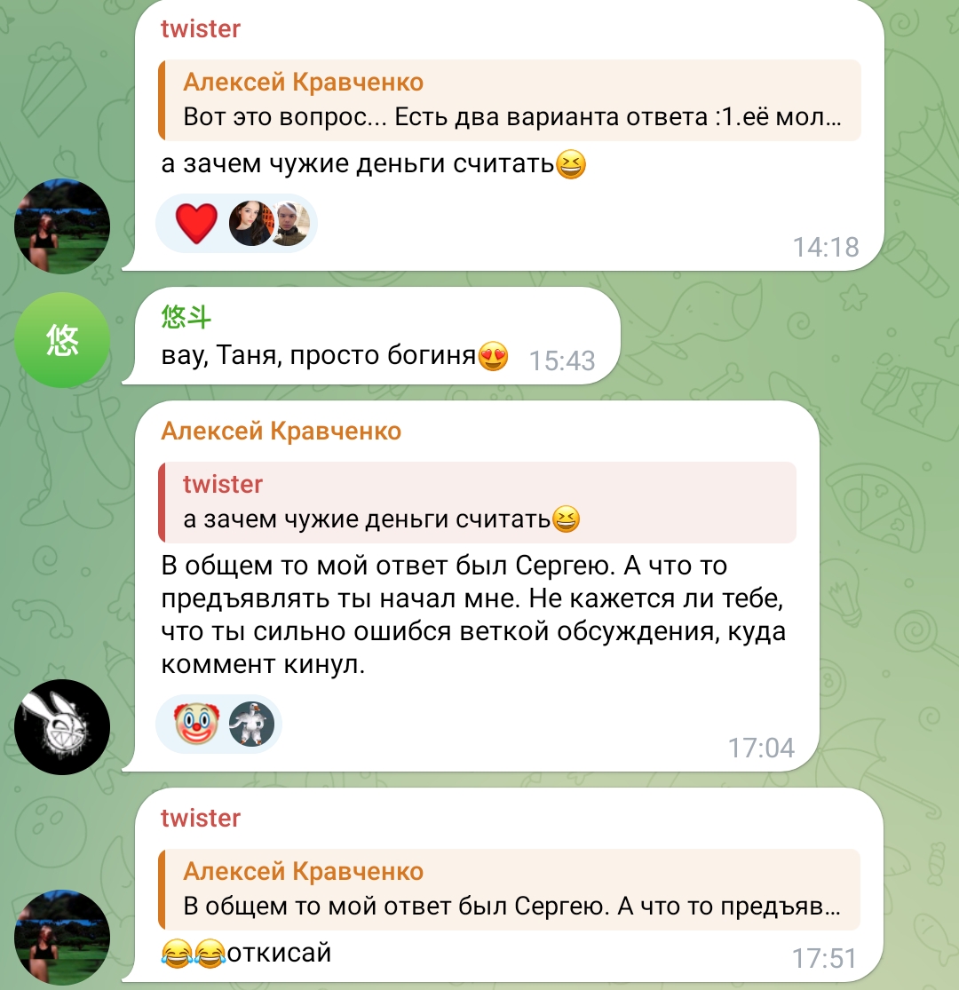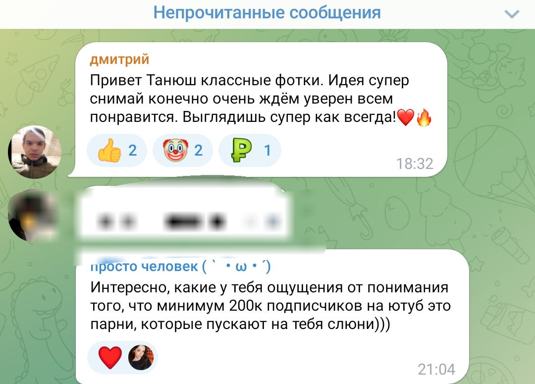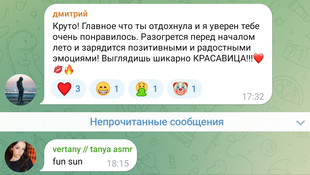 очень всё конечно интересно, но смотришь на этих девок в их телеграм каналах, и понимаешь, почему Таня точечно отсеивает весь мусор из своего реала, у неё в отличие от этих девок нет задачи найти мужика побогаче ибо уже найдено всё, и огромный опыт общения с двачерами, миллионерами, димками, ну или ей тупо нравится лизать ложку и шептать хуйню всякую, тогда это её призвание реально, смотрите танин асмр, и ни о чём больше не думайте.