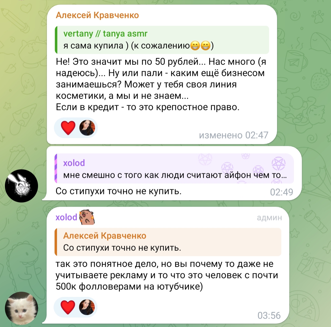 Этот лайк на этом коменте подтверждает, что большую роль в покупке айфона сыграли донаты димона. Тань ты хоть бы написала ему в личку, поблагодарила бы из вежливости.