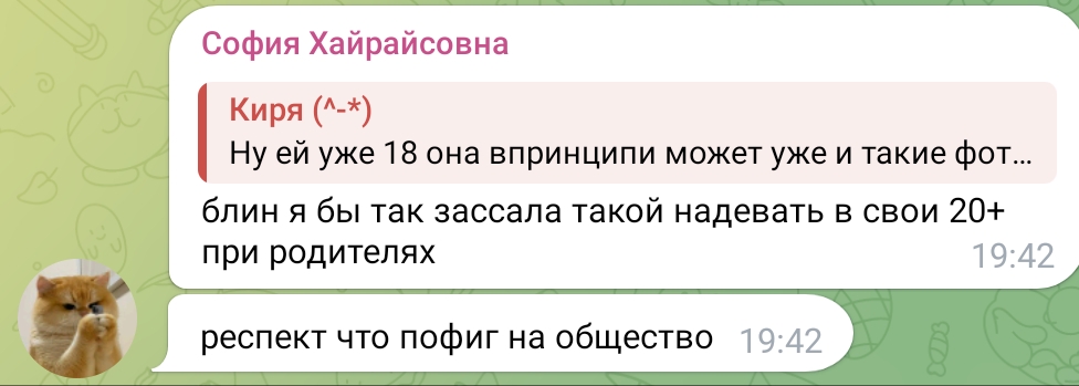 ну короче Таня запрещала им себя снимать, и "её родителей", иначе б ссылки не кидала на них, так что скромная первокурсница Таня может спать спокойно и быть уверена, сливам не бывать, ибо ещё три года учиться платить.