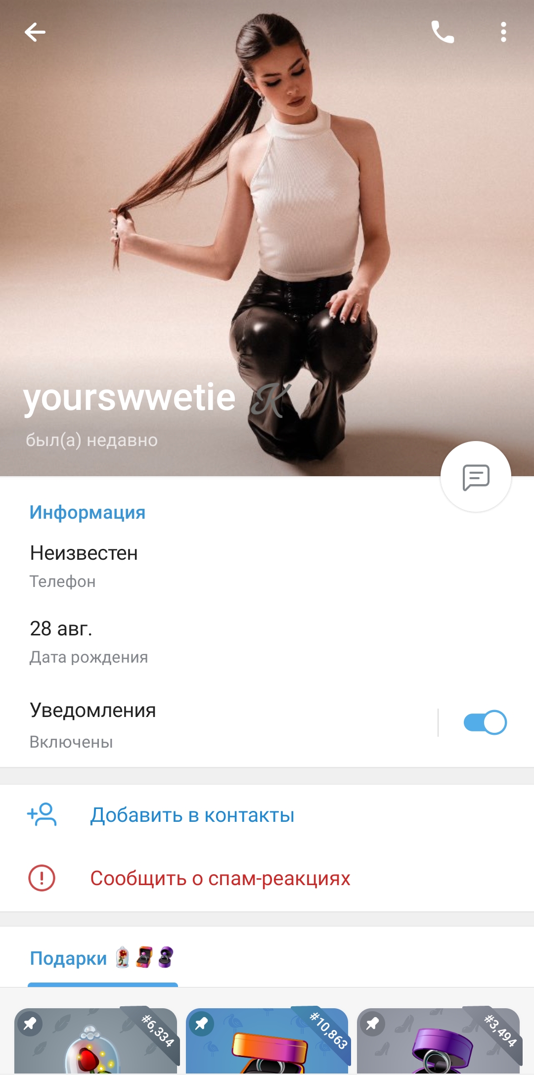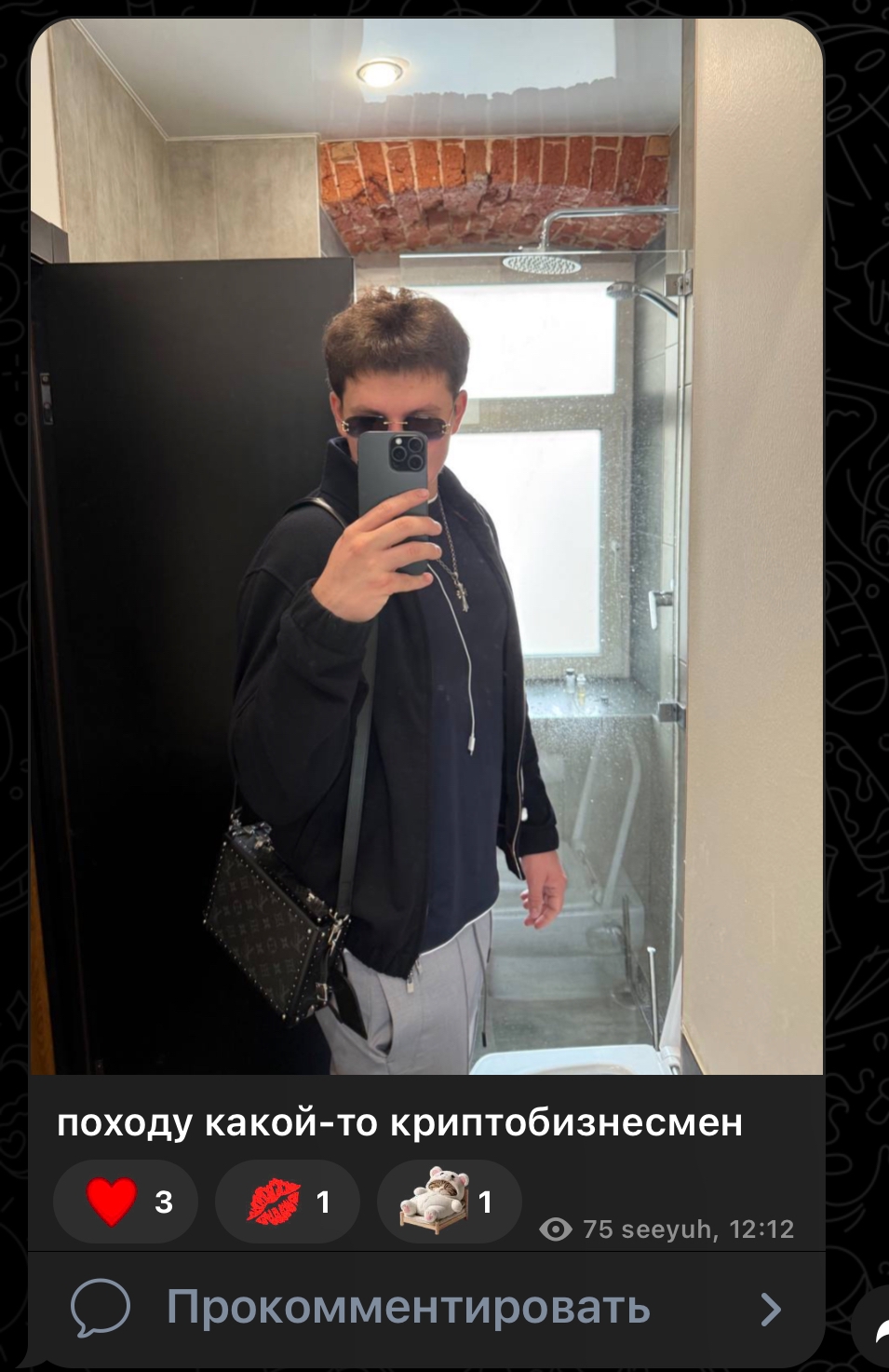 На вид обычный степашка. Но походу какой-то криптобизнесмен🤔 Ну чисто случайно так совпадает, что встречается она только с мажористыми гусями) Наверно совсем не знала кто и что, ну просто красивые подарки в тг кидал, вот и понравился..