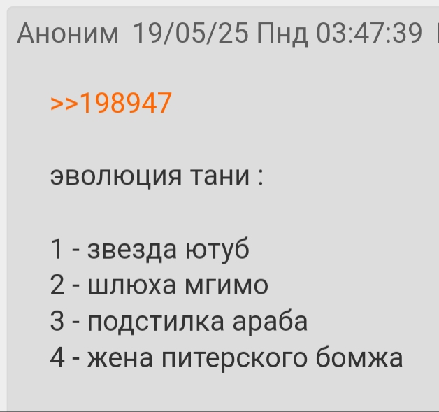 >>199034 Если бы все её подписчики сидели здезь, то то у неё в коментах ей бы никто не вылизывал. Потому что здесь показано, какая таня на самом деле. А у себя в телеграмме она скромная студентка которая поехала в турцию отдахнуть с родителями и её подписчики ей верят. Ты почитай коменты по внимательней, там же одно сплошное вылизывание. Такой нигатив к димону только потому, что он продолжает себя так вести. Терпит игнор и строчит комменты, как будто бы не чего не произошло. Хотя это больше похоже на сильную влюбленность. Димон настолько сильно влюбился в таню, что в других девушках он такой красоты не видит, тоесть смотрит на другую девушку а перед глазами стоит таня. И вот так просто отпустить человека он не может. Я хуй знает может я тут и хуйню какую то щас нису, но мне кажется это так. Ну эт моя теория.