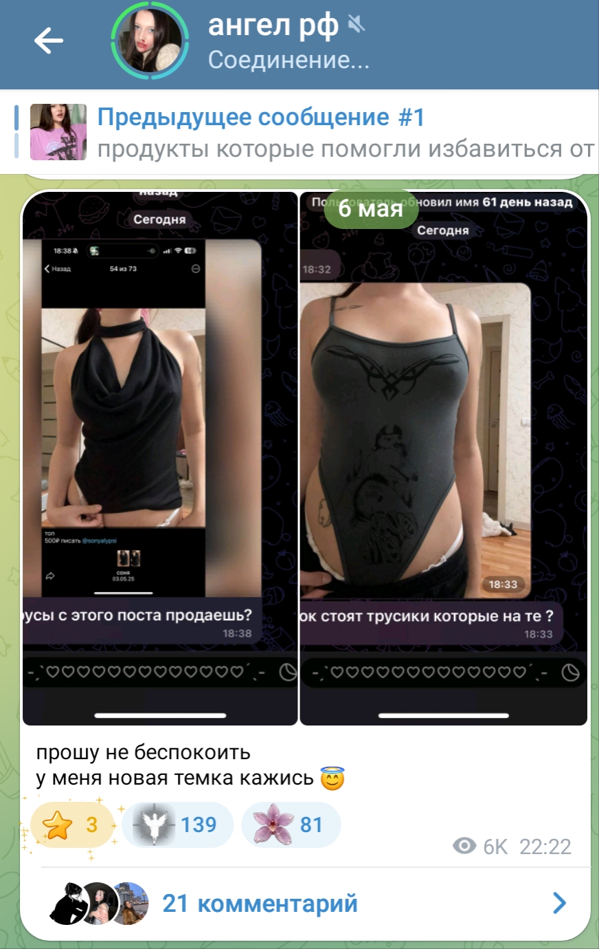 >>199105 без понятия о ком ты, но я уже тебе отвечал (круок в треде когда она это платье купила видно ареолы было именно в магазине, возможно это другое платье всё же) >>199109 вряд ли, она её видимо удалила ещё год назад - весь август тогда молчала не писала, может в больнице лежала изза пятна этого >>199110 он не только в телеге, он ей отлизывает и донатами и в ютубе в чате (не скрывает аву и ник в ютубе)