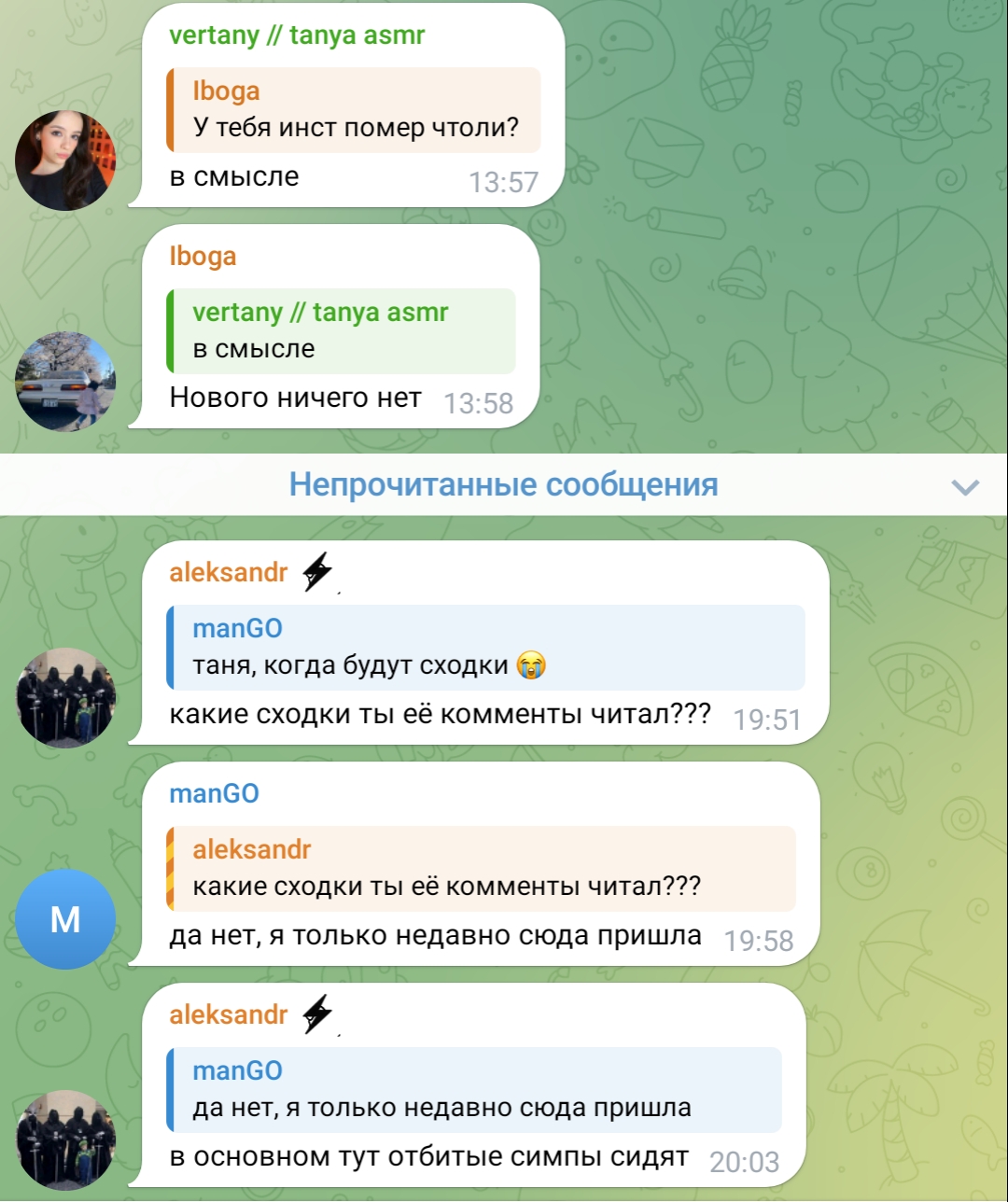 1 - найден ещё аккаунт танин новый и там про ваню 2 - димка обиделся походу 3 - тане скорее не понравилось что обсудаем тех девок и ткопали ещё один канал её (кстати, именно такая же фраза у вани была зимой)