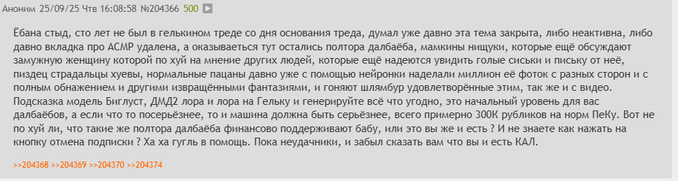 >>206253 Чел, это бесполезно объяснять. Малолетки-инцелки привыкли, что им письку светят "бывшие" АСМРщицы, которые по факту давно уже на онлик перешли и в другой тематике работают, которая с АСМР мало общего имеет. Тут же от Гели по факту требуют невозможного, что бы она как потасканная муна светила вареник и сиськи.