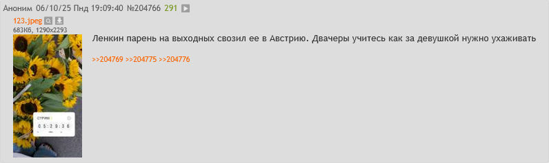 посты выше которые её засирают, делаю скорее её симпы, чтобы все считали нас хейтерами хотя лично я, просто хочу настоящих пруфов про подсолнухи, но раз всех всё устраивает и даже кто ей хамил в донатах тех, значит походу тут она сама и кто ей писал комменты на том стриме и сидят.