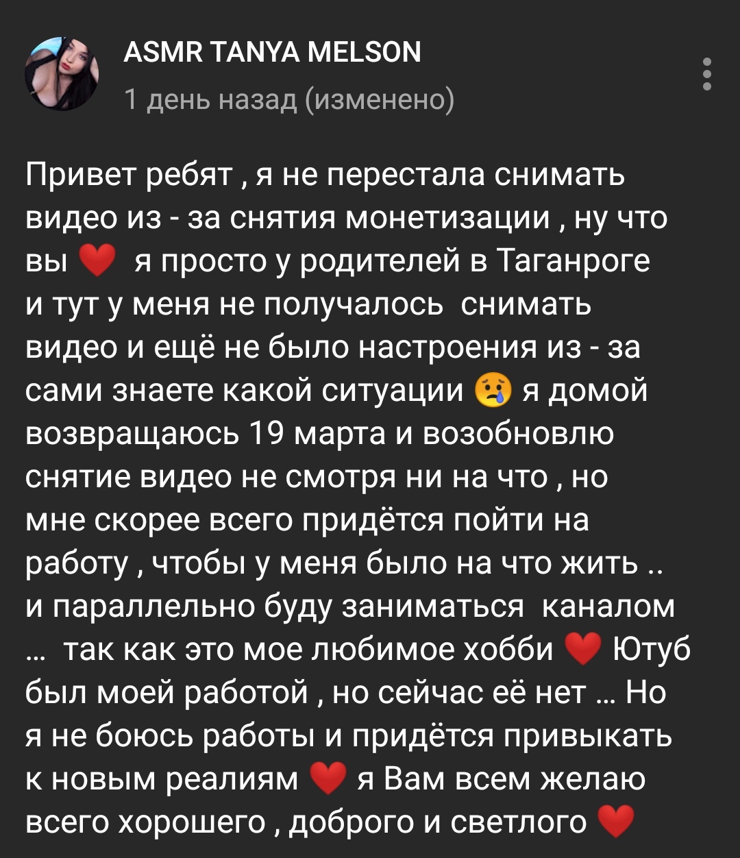 Я сразу понял, когда она стала оправдывааться, что вот вернулась, сейчас то всё будет, я понимал, что ничего не будет. Деньги идут, зачем что-то делать. Вот будут отписки, будет мотивация лить контент.