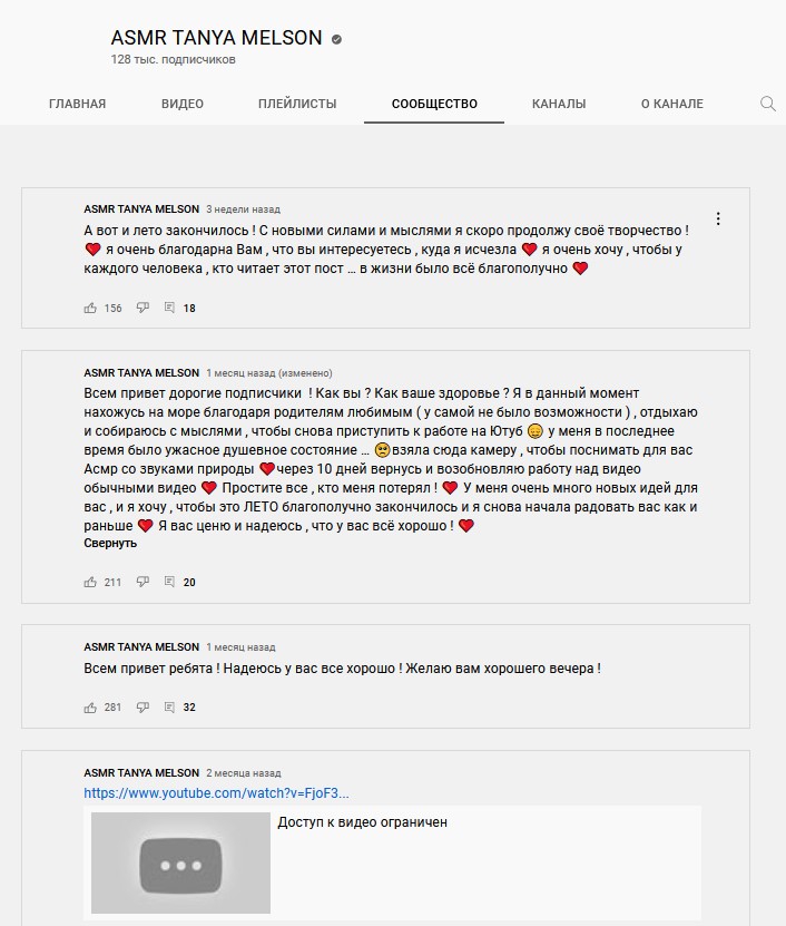 >>81960 >>81962 Она говорила, что канал взломали и удалили все видосы. Ссылки на онлик тоже отовсюду исчезли, даже из вк и инсты (там тоже, по-моему, были), хотя их не взламывали. Теперь хуй поймёшь, она будет его дальше вести или нет? Вроде новые фотки появляются, но и старых опять дохуя почикала.