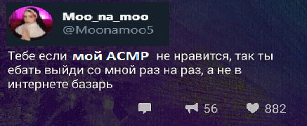Я хуею с малолетних еблоидов, говорящих что муна тоже сексуалезирует АСМР, гоня при этом на сисишалаву, Блядь, дурики, она же ясна сказала, что специально делает дроч контент, и понимает, что на это будут фапать, тем временем сисишалава утверждает, что это люди испорченные, и дрочат на неё, она же блядь у нас святая... А вообще, кто хейтит секс контент? Правильно, 13 летние девочки, для которых тема секса ух ебать какая запретная, СЕКС это НОРМА!