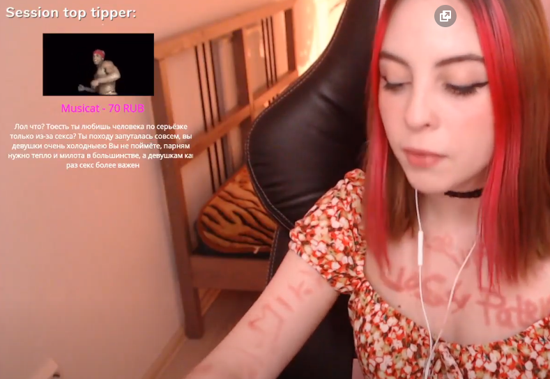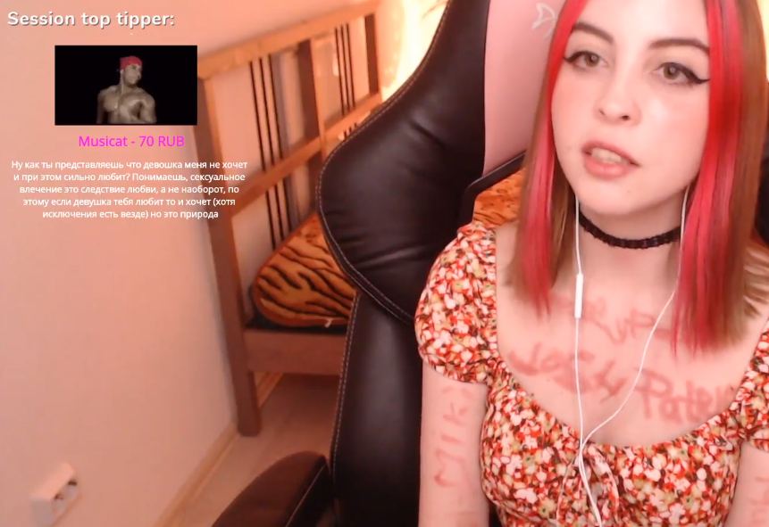 Фраза: "зрители просят меня лизать, я и лижу. просите презики, я и делаю превью, все делаю для вас и то что вы хотите". То есть она сама без просьб такое бы и не пилила, играет под дудку в героя для зрителей, а чего ж тогда отказывает в просьбых нюдесов в донатах? Так еще и на серьезных щщах говорить что лучше всем скинет фотки, чем одному, и то, за 1000к зеленых, цитирую буквально :) Ой, я не осуждал данные триггеры, дрочить на такое всласть) просто дохуя мимикрирует и не понять кто она и что.