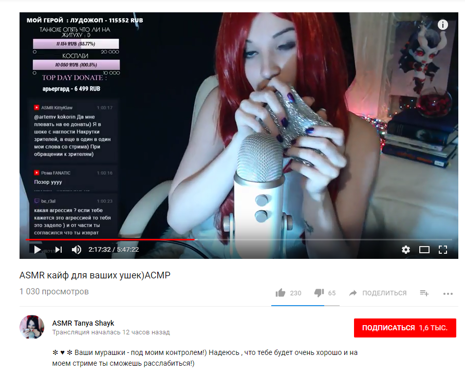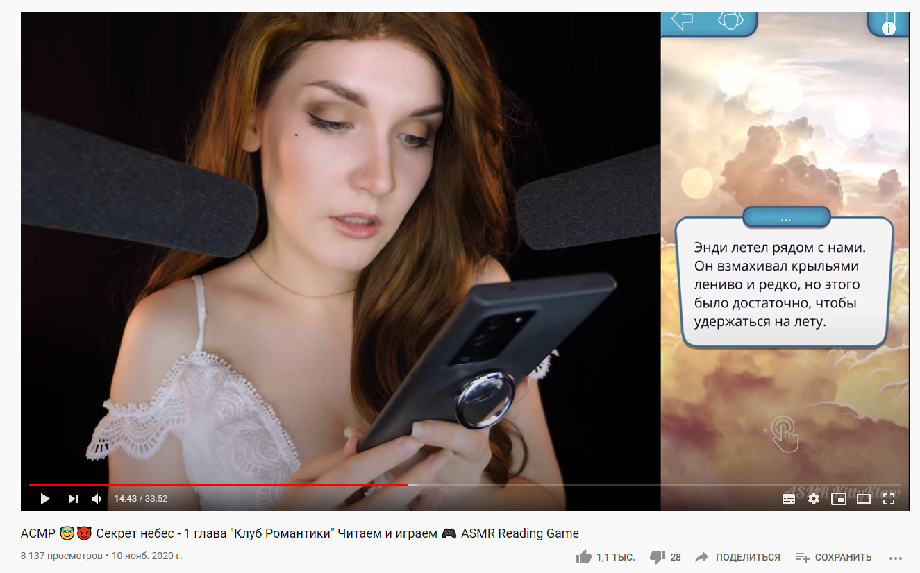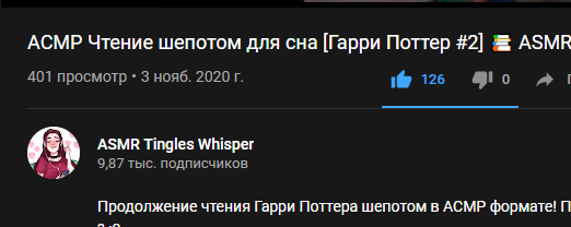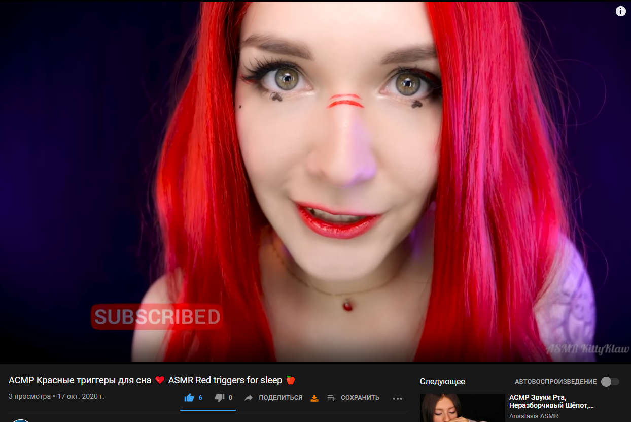 Когда она просто пытается пилить чистый ASMR в духе Асмрмании, выходит так себе и просмотры набегают разве что по инерции от предыдущего ролика с буферами.