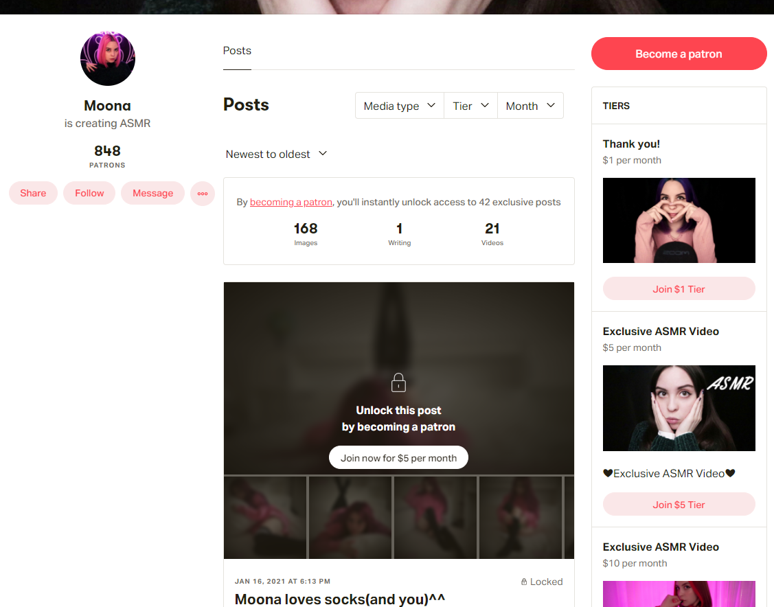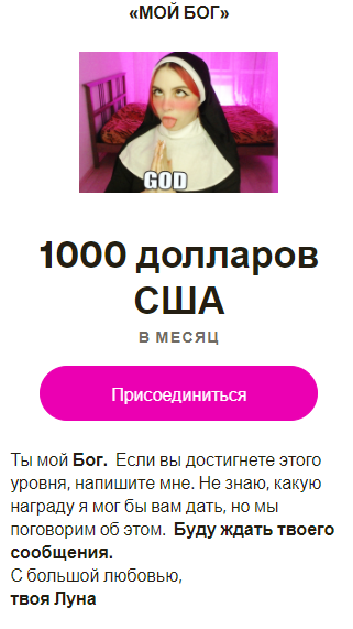 Выходит что с патреона выводит где-то 848$ ежемесячно. Так же там есть дорогие подписки за 50$ и возможность кидать чаевые, так что баксов 900$ должно быть. Нот бэд, учитывая контент уровня инстаграмма.