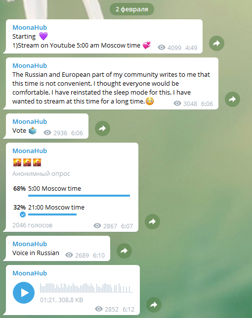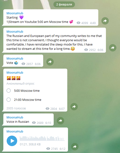 Кстати я уверен, если бы она СЕЙЧАС провела снова опрос, когда лучше стрим провести, многие бы ответили в другой раз. Думаю, что мнения бы разделились примерно 50/50, а не 25/75.