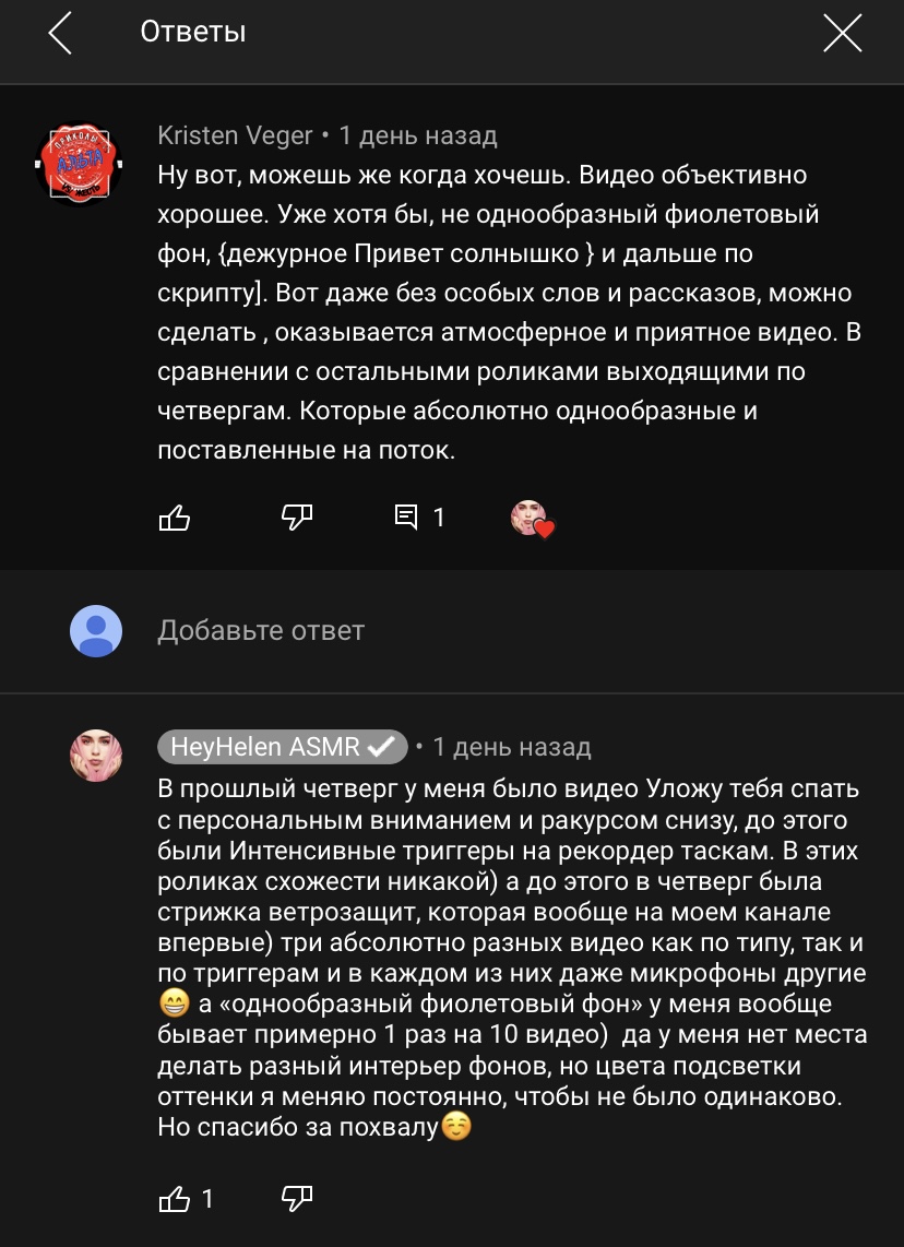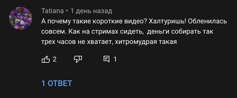 она вообще охуела или как? хватит донатить ей неделю, пусть старается. ей шептухи на выдохе с примесью эротики уже заебали, выпучит глаза и начинает наплямкивать в микро. пиздец. я подписан на каналы, где 30к подписчиков и они радуют зрителей новыми идеями, а у нее блять 850к и она каждый видос ПЛЯМ ПЛЯМ и дышит как маньяк. ты вообще там озверела? старайся давай