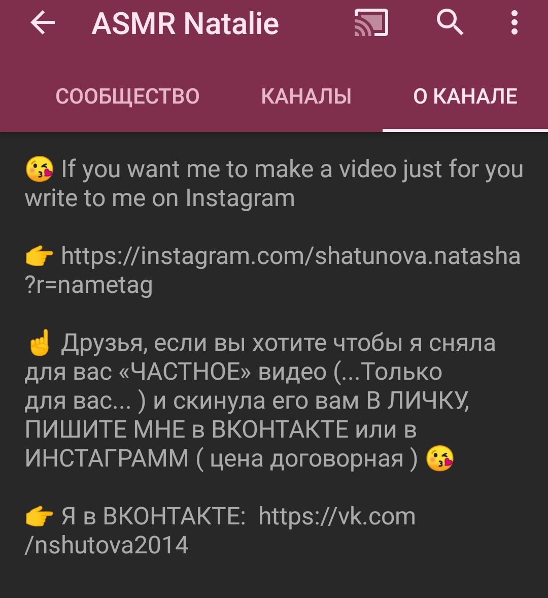 После того как тут начали появляться многочисленные ссылки на откровенно порнографические видео Natalie уже как несколько раз поменяла название канала на YouTube. Сегодня она под ником Agswmpr или @Agsvmpr https://boosty.to/asmrnatalie это на бусте это в инстаграмм https://instagram.com/kiko32112356?igshid=YmMyMTA2M2Y%3D Но думаю, что после этого поста имя снова поменяет... ТРУСИХА :) Уже засветилась!!!! из интернета не удалить теперь :)