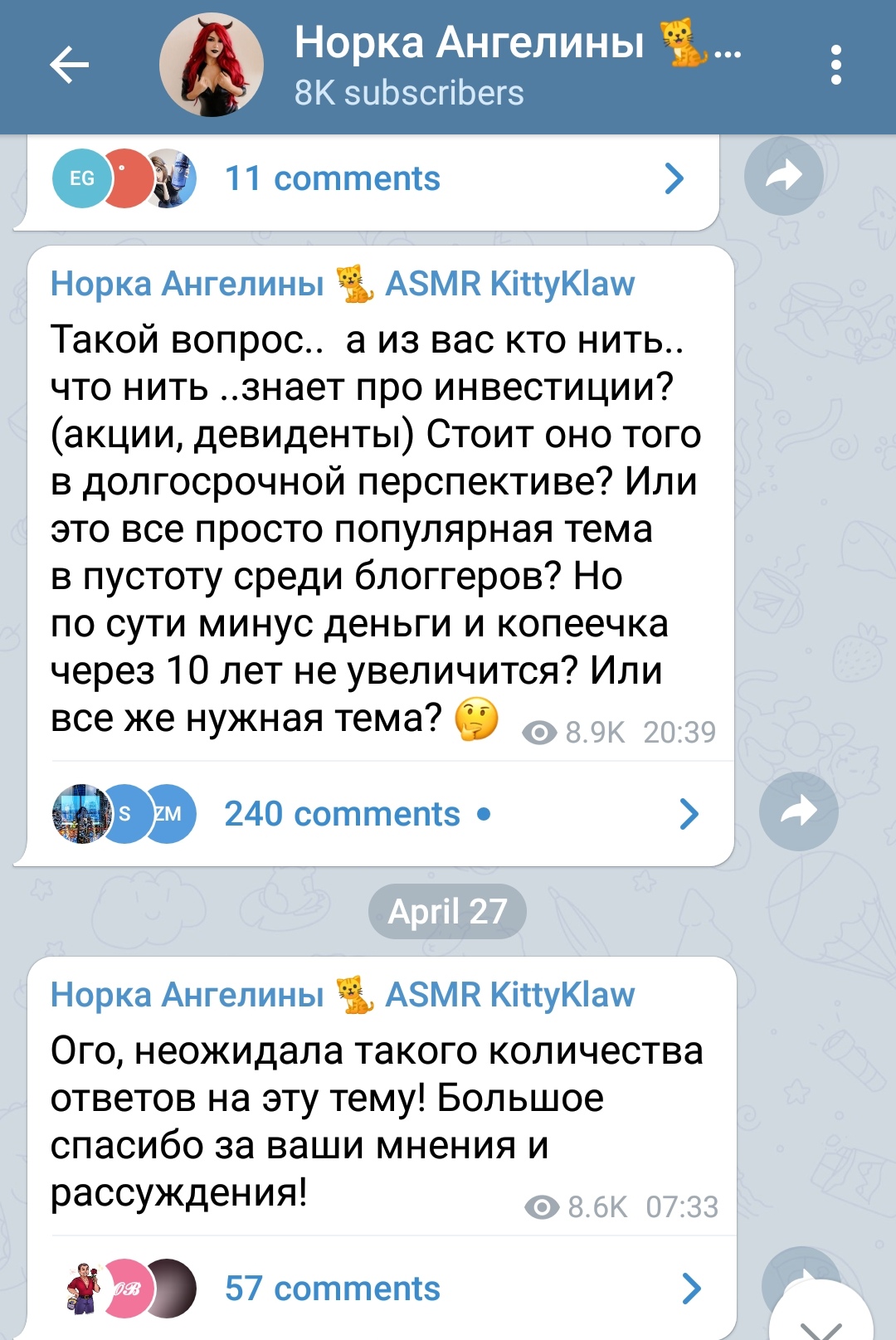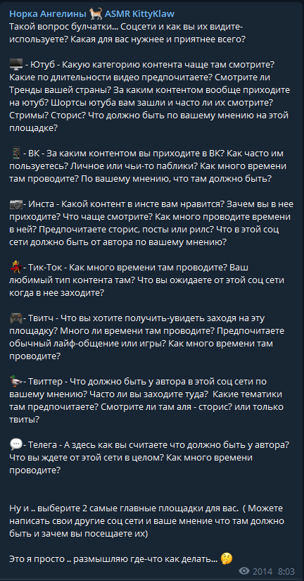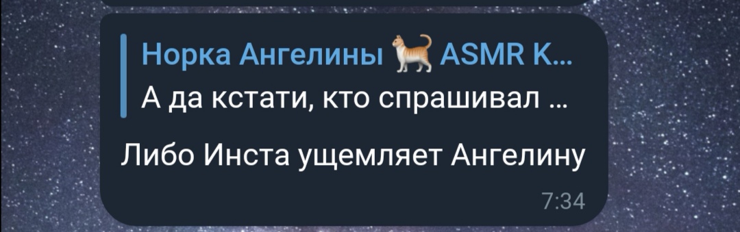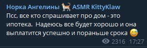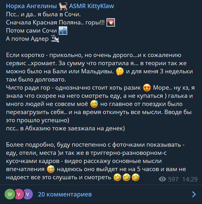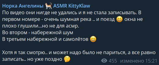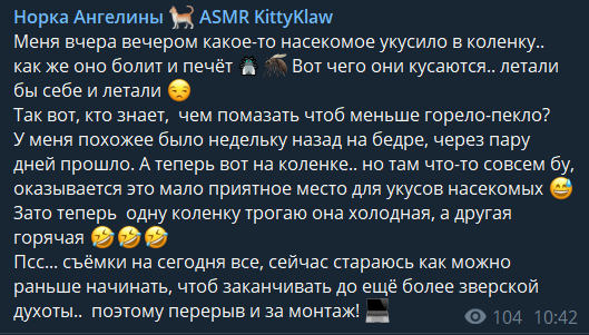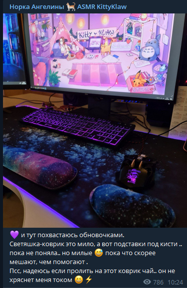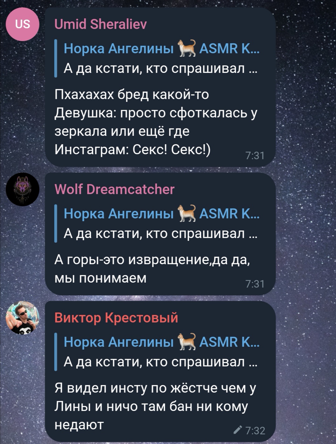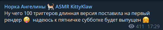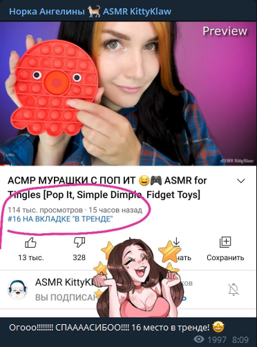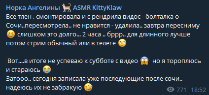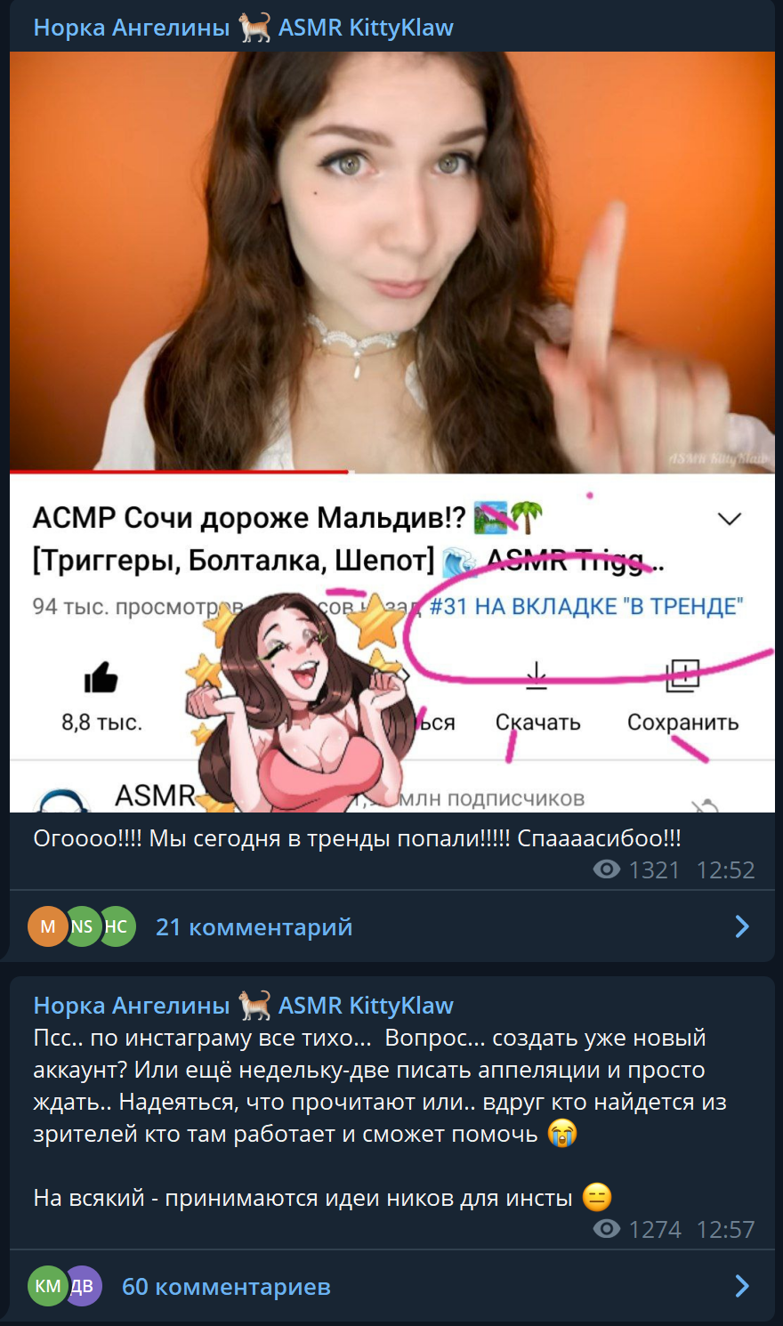 Выкатился из асмр-темы года 3-4 назад. Помню, в вебм-тредах кто-то начал её форсить, там сюжет был на уровне "мамка шепчет сыночку". Подписался на Ангелину, сидел на её потоках на твиче, там в сумме с твича и ютуба онлайн был в районе 100-200 человек. Сидела смущалась, читала сказки и спамила черничку, жаловалась, что живёт с тёткой вроде, и тётка не одобряет её деятельность. В итоге сегодня вижу её видос в трендах, охуел от 2 лямов подписчиков, а ещё больше охуел, что она все эти годы так и гоняет по кругу сказки и пару триггеров, пиздец. Единственное, что увидел нового - это продажа фоток своего сральника. Грустно, что она при таких "достижениях" в топе.