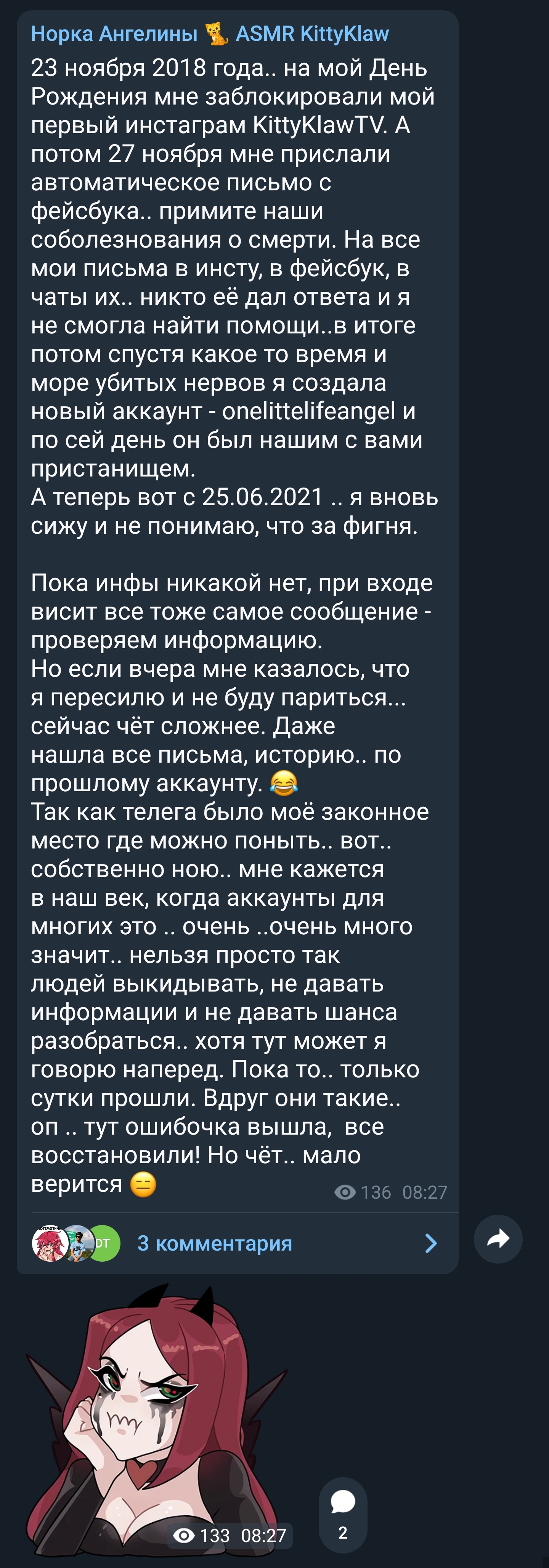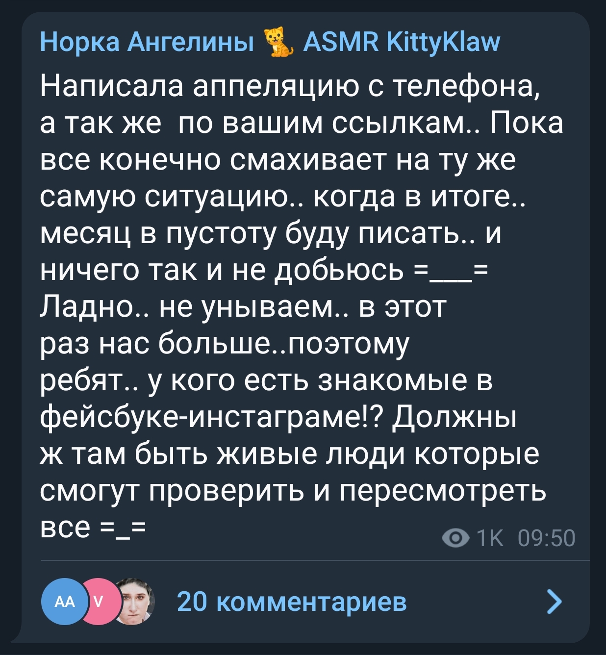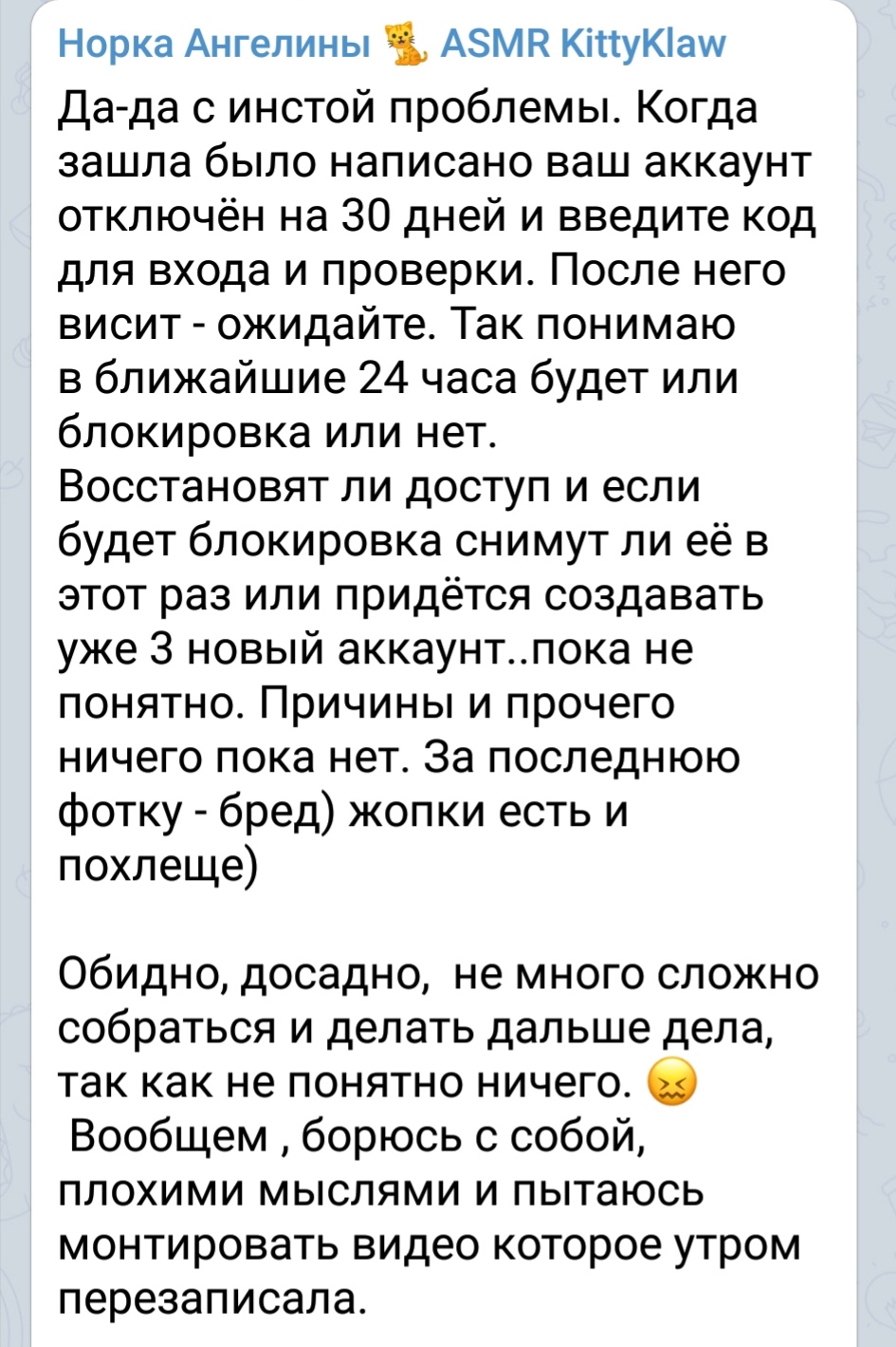 >>81458 >потому что кто-то стал жаловаться и много Откуда инфа, если она сама говорит, что фб не объясняя ничего ставит перед фактом и всё? Она где-то говорила, что ей репорты кидают, пользователи инсты?