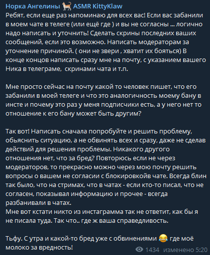 И это повторяется. Она начинает строить из себя невинную и пеняет на других. Я не говорю, что КК что-то не так сделала, что она заслужила этих банов. Конечно нет, но ведёт она себя конечно очень мерзко иногда.
