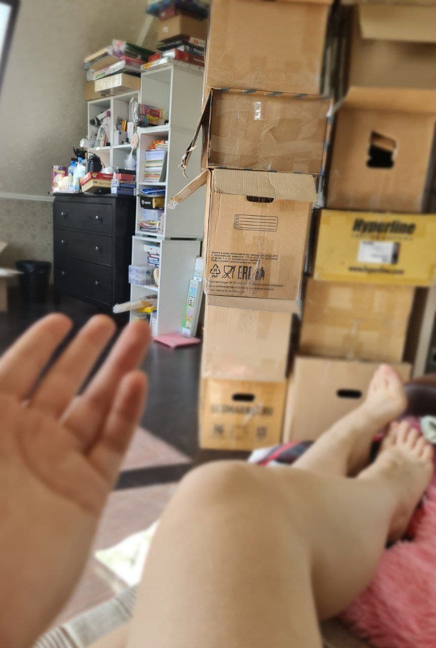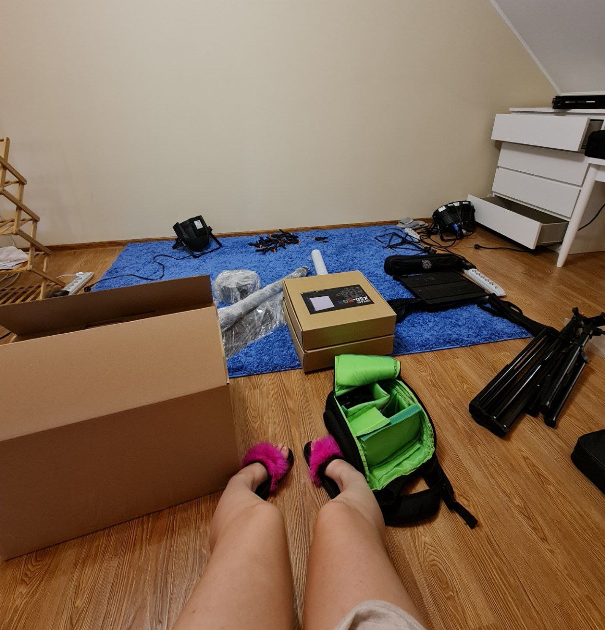 Неаккуратное распихивание чееек... до аккуратного.. как до луны ....... Ещё остались в коробках микрофоны-камеры-свет и т.п. но они ждут в коробках готовой комнаты для съёмок