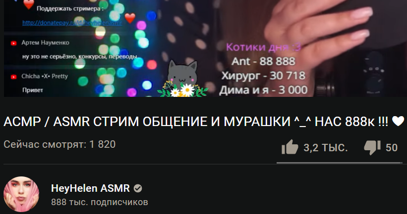 Ааааа, всё с вами понятно)))) Прочитал на лурке про АСМР. Там про вас и топ донатеров написано))) Lurkmore: Задроты проводят всё свободное время в попытках заиграть самым неуклюжим образом с той или иной АСМР-богиней, не понятно на что надеясь, в промежутках тусуясь на унылых форумах и бордах, где обсуждают сиськи и голос очередной тян. Их затроллить не менее просто: достаточно лишь указать на очевидность их бытия, что они жалкие девственники, а богиню прямо сейчас трахает альфа-самец.