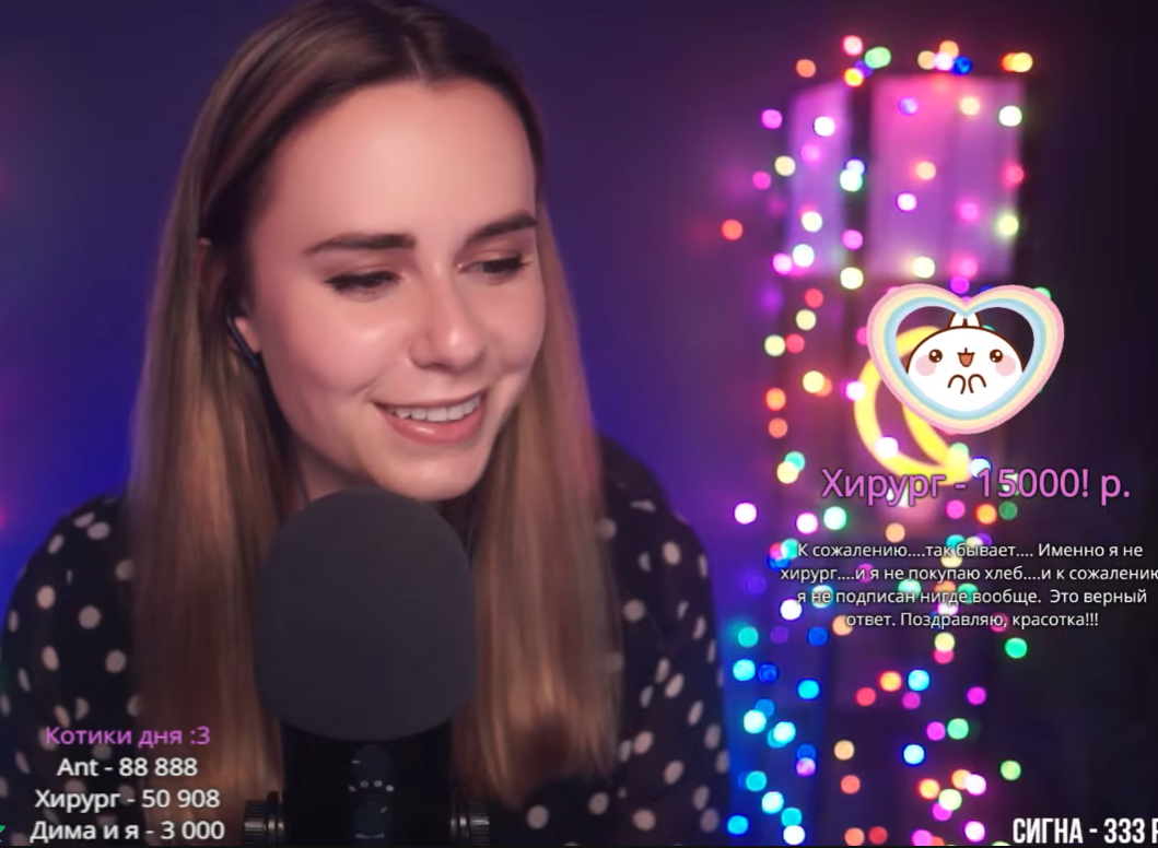 Аноны, уже давно надо понять, что Ленка девушка крайне эмоциональная, на личные вопросы отвечает исключительно под настроение, так сказать. Если есть желание "покататься" на этих "эмоциональных качелях", то нужно грамотно подобрать последовательность вопросов и сумм донатов (точно НЕ очень больших) И всё получится, ответы будут (даже правдивые), а если и чатик будет "помогать" - то точно получится. Можно ещё проанализировать реакции на донаты...