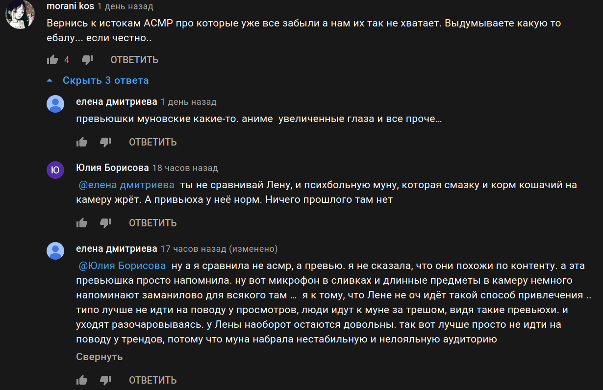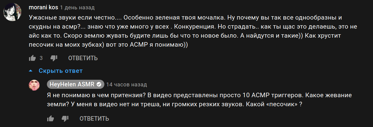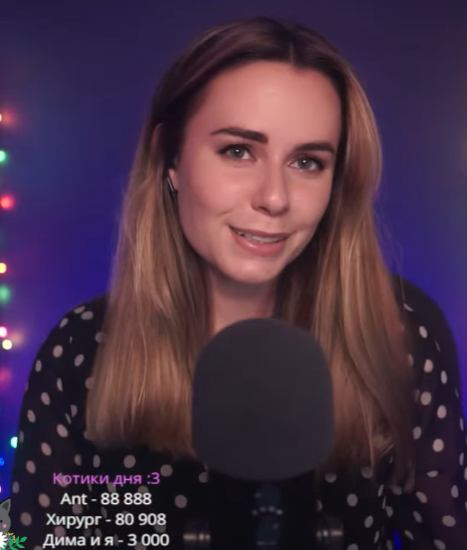 люди обезумели и считают, что нормально записывать свой рот, свои слюни, своё плямканье и ещё и рубить деньги на том, что кто-то ночью один и хочет расслабиться. безвольные дурачки влюбляются в образ, который шепчет и стоново дышит им в уши, каждый раз представляя что они будут ее парнями и она им будет стонать так на ухо и плямкать, чтобы ууспокоить мх после завода она просто рубит бабки на своих слюнях она не одна такая, чсв дохуя сейчас на ютубе она если бы могла то в краковке слюни продавала бы