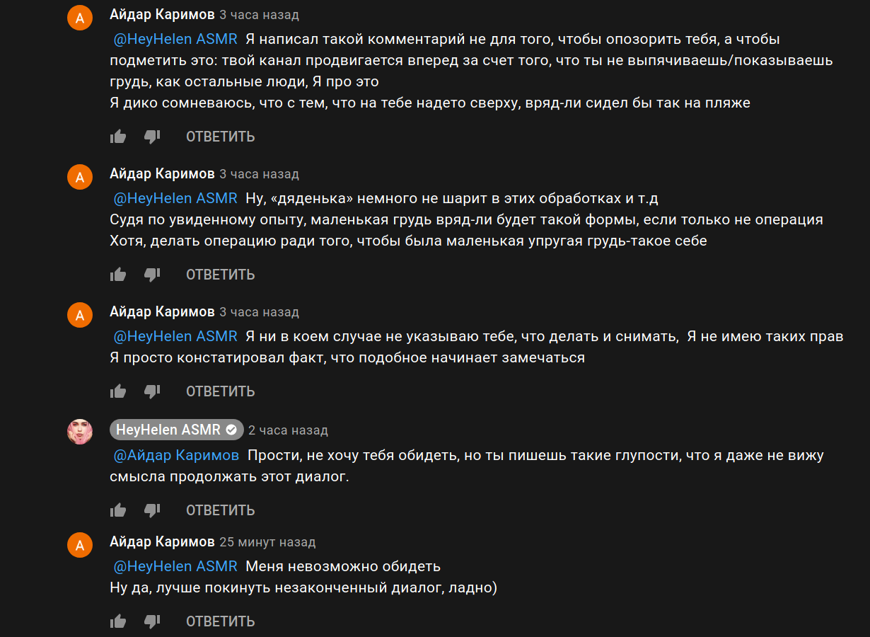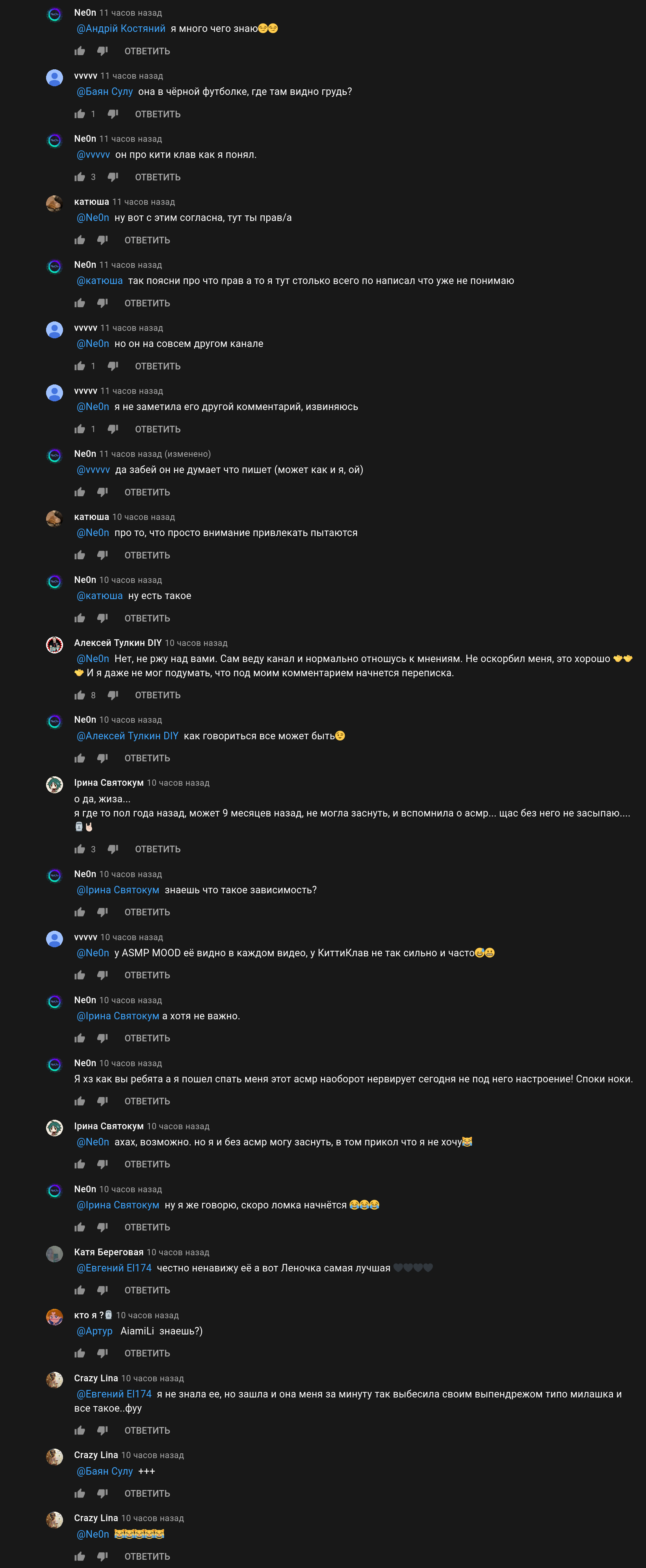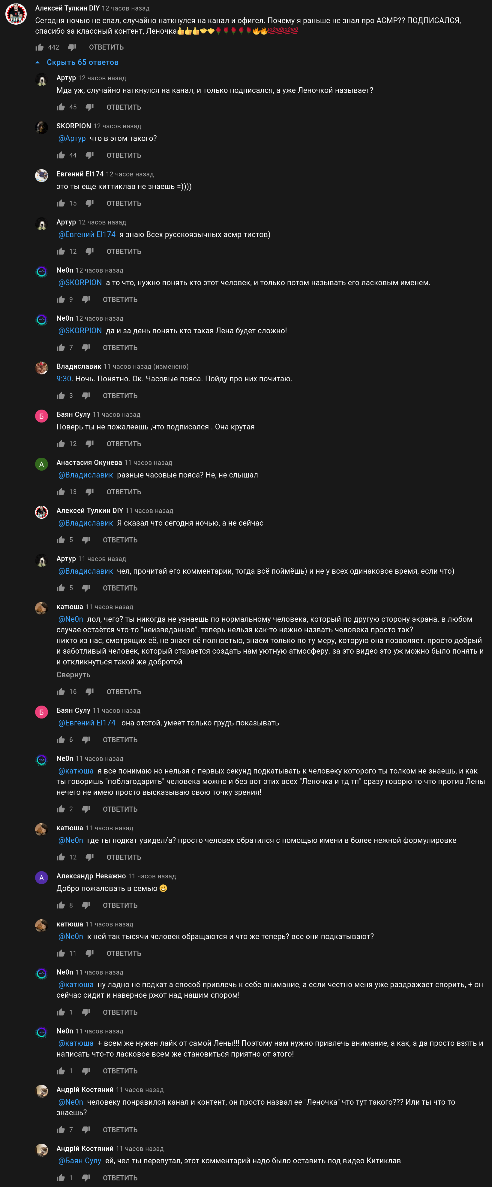>>82148 Ахуенно) Прикол в том, что я её не защищаю и не оправдываю. Лена самая обычная девушка без каких либо талантов. Проще говоря, она нихуя не умеет. Если бы не асмр у неё никогда бы не получилось стать медийной. Мне вообще не понятно почему взрослые состоятельные мужики влюбляются и тратят своё время, главное деньги на таких вот ютубных Лен. Можно же скачать приложение для знакомств, но нет блять. Что сука происходит с этим миром?