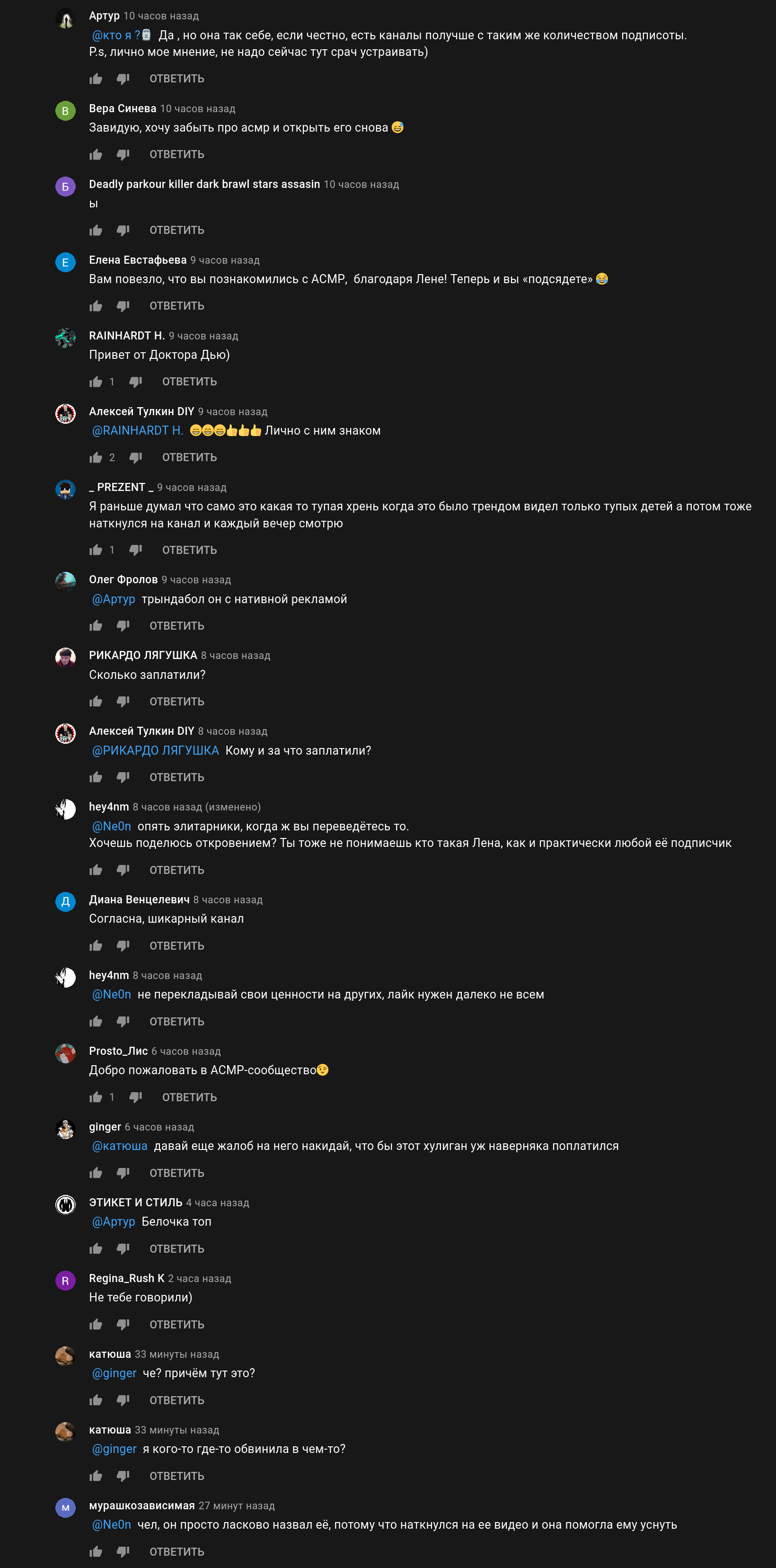 как в 21 веке понять, что человек деградирует? он обстраивает свою жизнь, жилище, манеры и привычки для создания комфортных условий, в которых он сможет с легкостью деградировать (снимать асмр звуки рта и прочую хуйню с тупыми названиями и смайлами). все для удобства звуков рта, плямканья, тяпканья и прочей хуйни, которая смотрится такими же стремящимися к саморазрушению людьми. так же Лена для комфортного плямканья наняла кучу модеров, дабы ни один хейтер не побудил Лену прекратить плямканье и нарушить зону плямканного комфорта. для продолжения плямканья и хруста слюнями Лена также организовала сообщество вк, куда попадают люди, желающие быть написанныен на листке, как спонсоры плямканья в микрофон. организаторы комфортного плямканья. все это преподносится пс серьезным и важным видом, никаких шуток! люди смотрят плямканье и расслабляются! фон, стол, стул, куча денег ради того, что микрофон записал чмаканье слюней