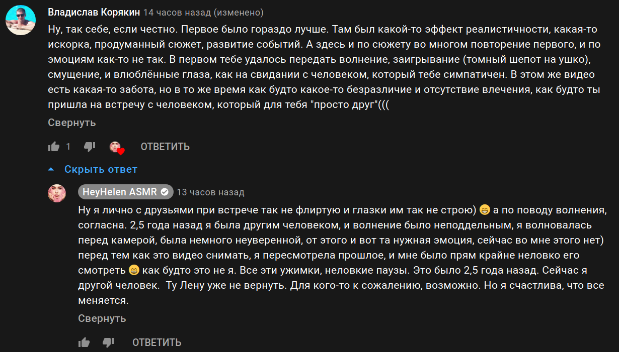 >>83191 Ничего нового. Делал ей такое же замечание года полтора назад по поводу другого видоса. Ответ был тот же самый. Забудьте про неувереную Лену, она уже привыкла к камере. В принципе логично. Ламповости из-за неуверенности уже не будет. Зря чел на это давит, а она и рада зацепится за это. Главная проблема это самоповтор! Нет никаких новых идей в этом видео. Тема не раскрыта, нет развития! Судя по коментам под видео, на стримах ее доебали таки: раз общала то делай. Вот и выпулила, а бы сделать.