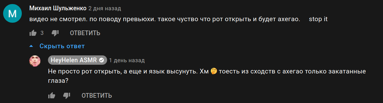 >>83223 >одинаково хуево смотрят Ну по 200-300к большинство. Повторюсь просмотры упали у всех кто делает именно АСМР в привычном его виде. Кто делает трэш прон смихуечки у того все гуд. У нас рыночек порешал и точка. И не важно какой блять сценарий или фон или какую вы там еще хуетень предлагаете. >чувства дежавю. Да бывает но, например у Муны в роликах чувство дежавю все время, такое ощущение что я смотрю один и тот же ролик по 10 кругу. Но просмотры при этом хороши, так как на обложках сиськи, хуи, смазки, спермач и т.д.
