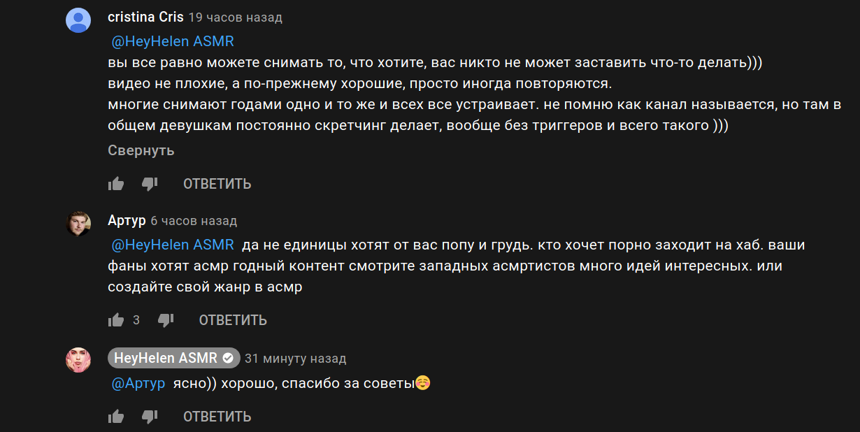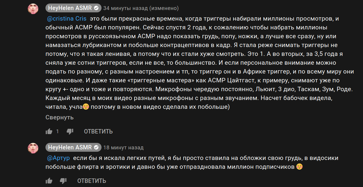 Но даже такие сиськи жопы на показ далеко не гарантируют выстрела видоса. Лена просто не интересовалась этим вопросом. Не хочет выставлять да и хер с ней. Она просто наскучила олдовой аудитории и они перестают ее смотреть. И Ютуб активно в этом помогает. Изменил алгоритмы продвижения и перестал делать рассылку и уведомления если ты пропускаешь новые видосы на том или ином канале. Это не только асмр касается. Ютуб считает что канал тебе не интересен и поэтому перестает присылать уведомления.