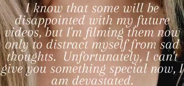 Я знаю, что некоторые будут рады моим будущим видео, но я снимаю их сейчас, только отвлекая себя от грустных мыслей. К сожалению, сейчас я не могу дать вам ничего особенного, я опустошен.