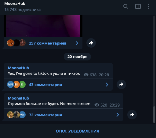 Мне очень нравятся мои стримы :) И я всегда делал то, что мне нравится. Но YouTube и Twitch запрещают мой контент :) Я решил, что будет лучше, если я этого не сделаю. Но это было очень весело. Мои стримы стали объектом ненависти, что убило во мне мотивацию. Но мне не грустно, потому что я собираюсь захватить мир И, может быть, я изменю назовите Moona на что-нибудь другое, можете подсказать варианты :)