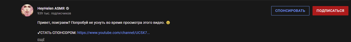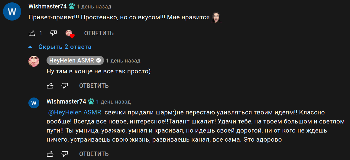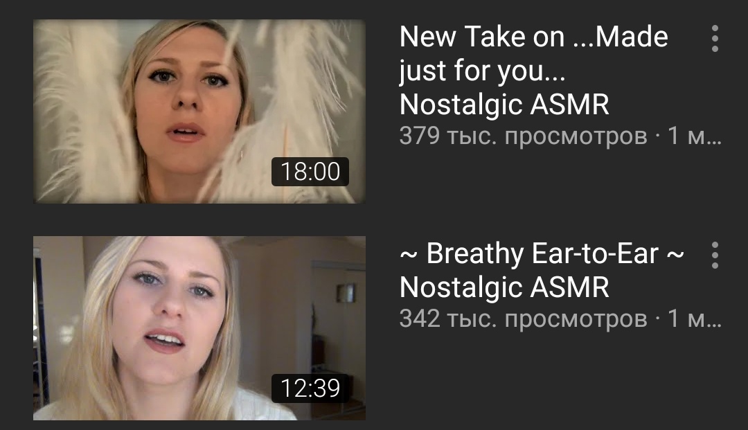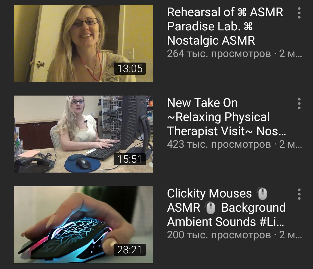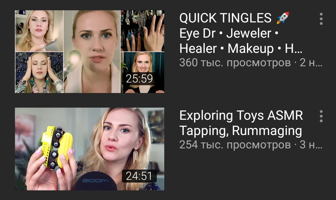 >>89265 - человек узнал, что существуют другие асмр каналы У 99% асмр блоггеров одни и те же названия, превьюхи и тематики видосов. Они за несколько лет существования жанров просекли, какие надо делать видео, чтобы попасть в рекомендации и собрать просмотры. Блоггеров с оригинальным асмр контентом щас очень мало