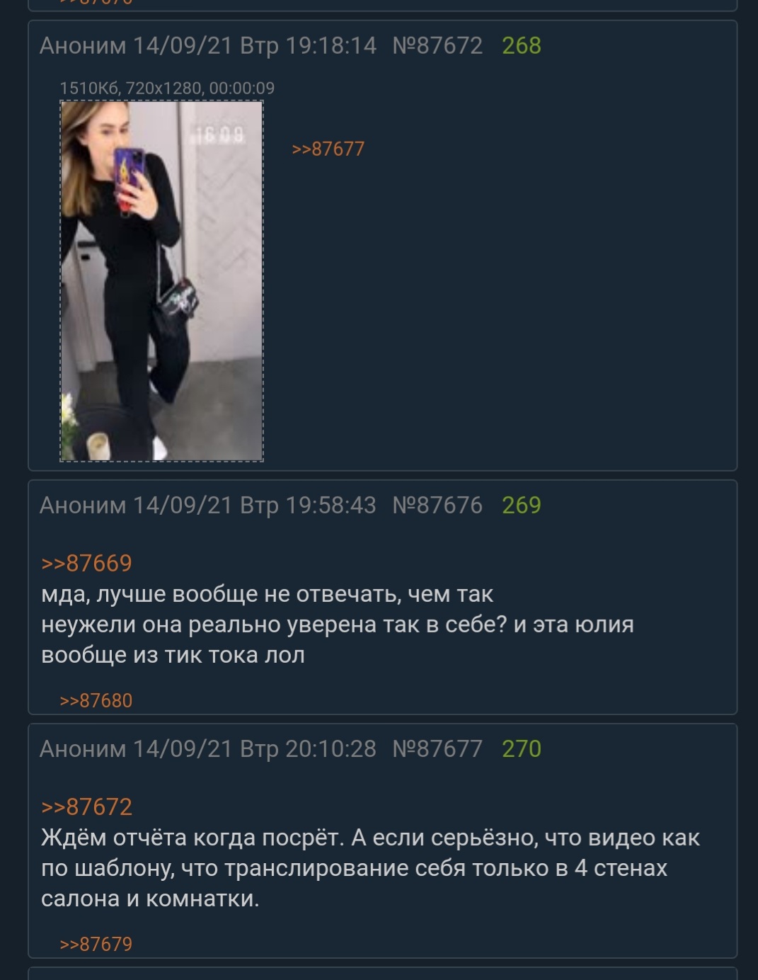 Анон, а почему она должна ходить сюда? Сюда ходят её рваные модеры - это максимум. Может я смысл твоей жалкой жизни ломаю? Если ты её тут защищаешь или обсираешь и мечтаешь, что она всё это читает, и искренне тебя благодарит или ненавидит, продолжай мечтать дальше:)
