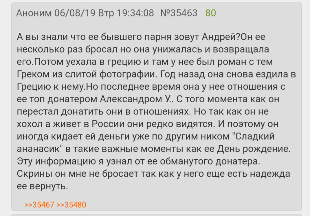 >>90400 >В первом или втором треде был анон, который утверждал, что у неё был парень по имени Андрей. Он несколько раз бросал её, но она унижалась и возвращала его. А потом он якобы уехал в Россию. Какой то время он донатил ей под ником "Сладкий ананас".