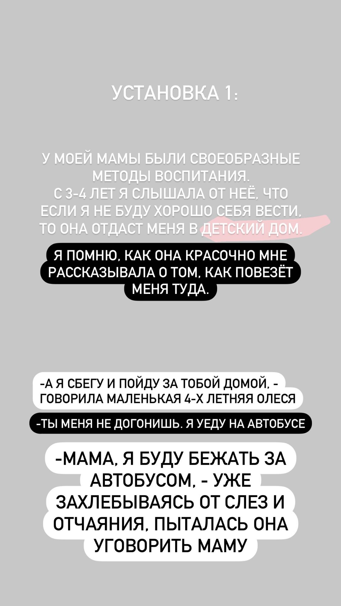 Мне было 4 года. -Я не хочу одевать эти колготки, я их не люблю. Они жесткие! -Если ты не будешь меня слушаться, я отвезу тебя в детский дом. Оставлю тебя там и ты меня больше никогда не увидишь. -А я не останусь там. Я пойду за тобой! -Ты не сможешь. Я уеду на автобусе, а ты не знаешь дорогу домой и не сможешь вернуться. -Мама, я буду бежать за автобусом… Глаза наполнились слезами, а все тело какой-то невероятно мучительной болью. Я представила, что больше никогда не увижу маму.