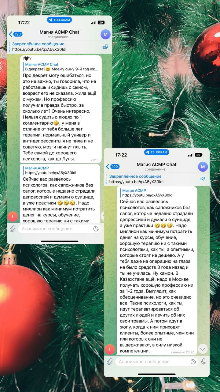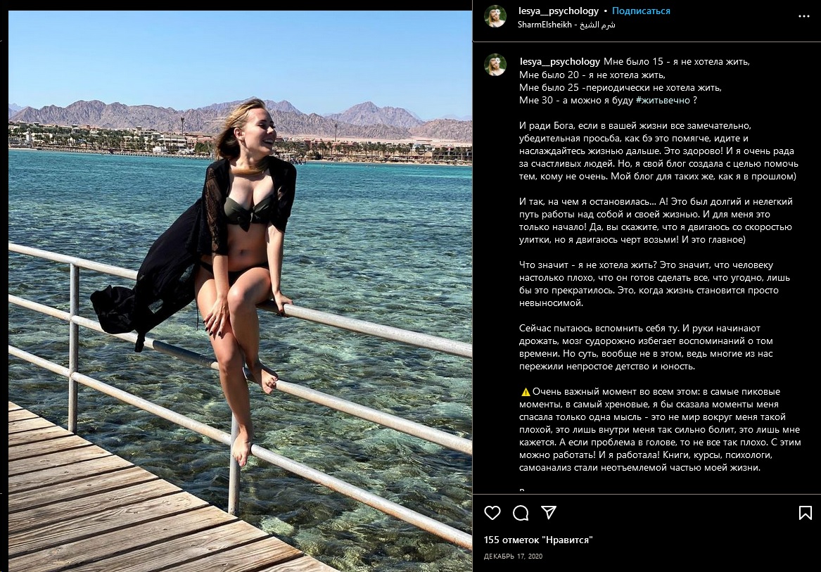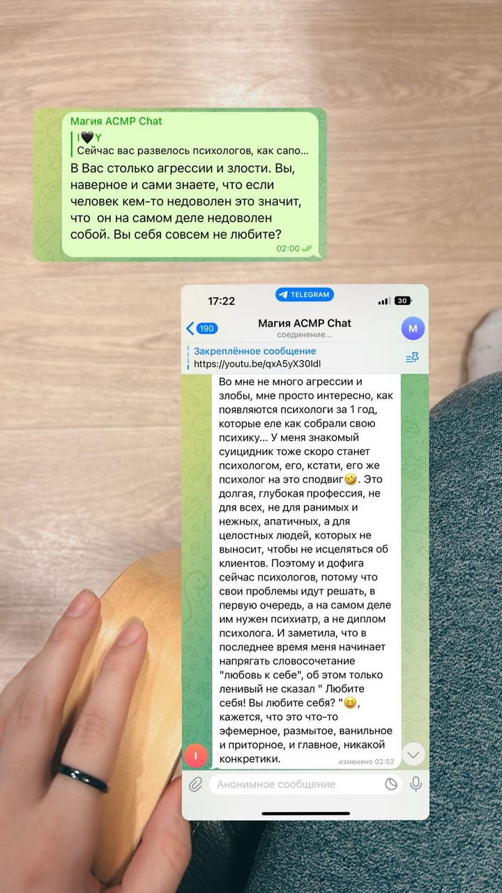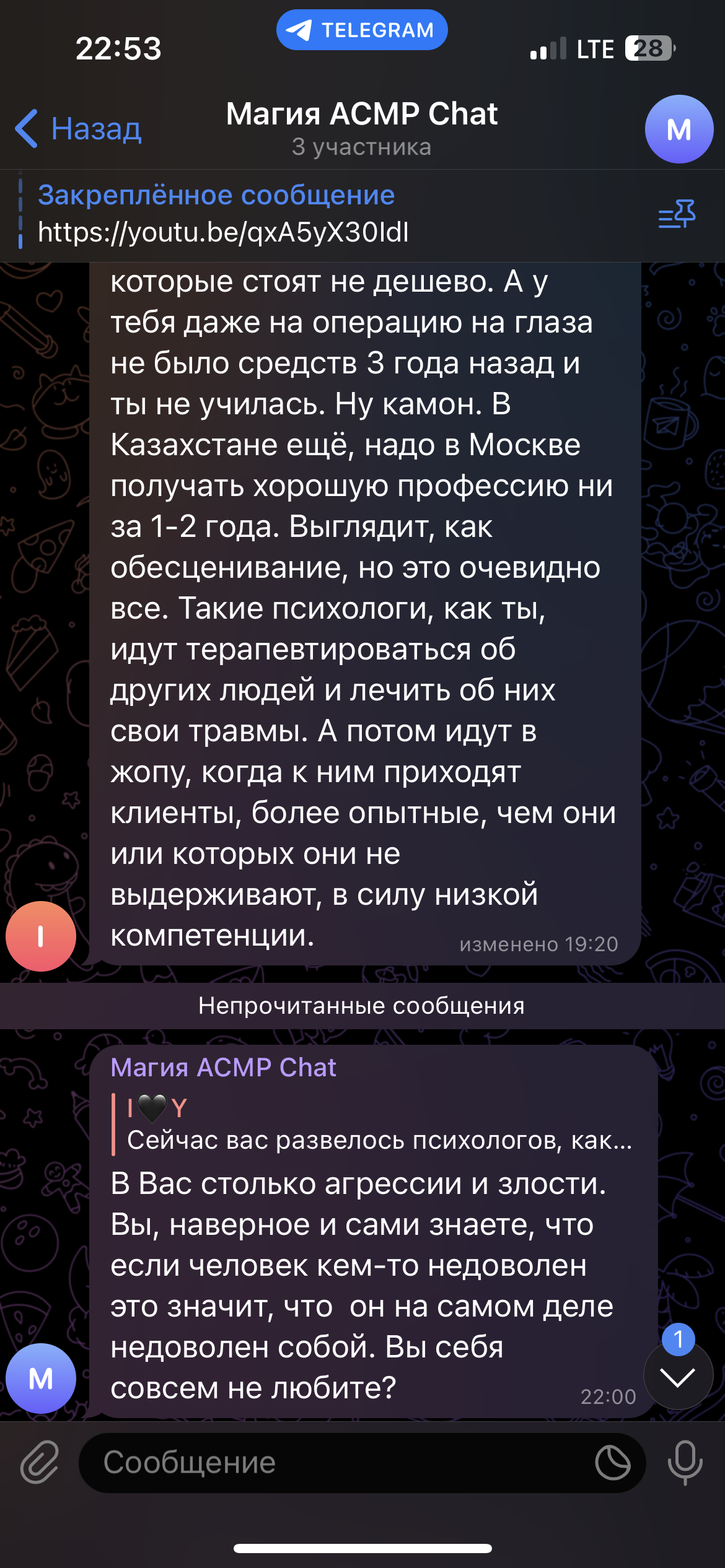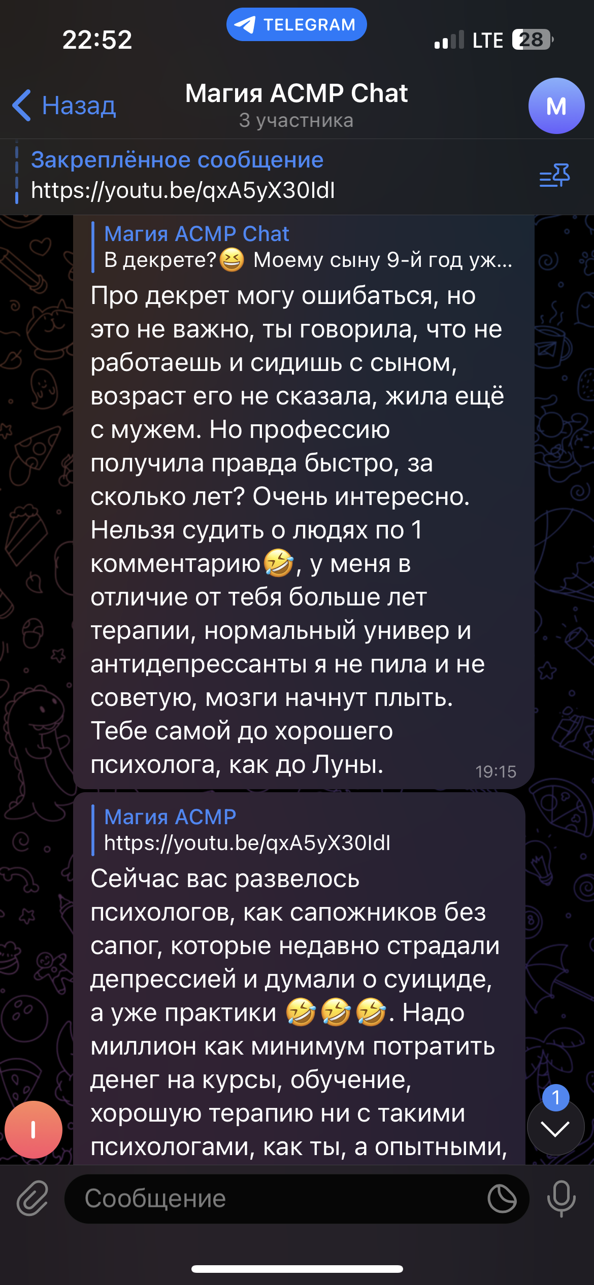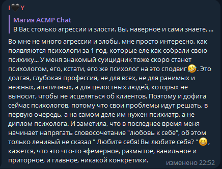 >>129685 Предположим, человек не подозревает, что его проблемы реальные. И вместо обращения к грамотному специалисту, который мог бы заметить неладное и правильно сориентировать, человек обращается к такой вот Леське и получает парочку неверных рекомендаций с последствиями. Не у всех хватит ума, или смелости, или времени дойти до нормального психолога, а инстаграмчик всегда под рукой.