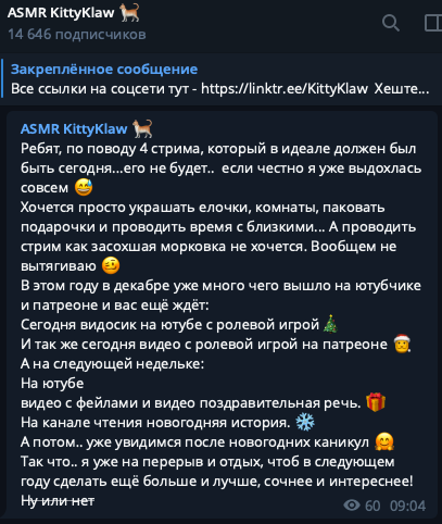Ребят, по поводу 4 стрима, который в идеале должен был быть сегодня...его не будет.. если честно я уже выдохлась совсем Хочется просто украшать елочки, комнаты, паковать подарочки и проводить время с близкими... А проводить стрим как засохшая морковка не хочется. Вообщем не вытягиваю В этом году в декабре уже много чего вышло на ютубчике и патреоне и вас ещё ждёт: Сегодня видосик на ютубе с ролевой игрой И так же сегодня видео с ролевой игрой на патреоне А на следующей недельке: На ютубе видео с фейлами и видео поздравительная речь. На канале чтения новогодняя история. ❄️ А потом.. уже увидимся после новогодних каникул Так что.. я уже на перерыв и отдых, чтоб в следующем году сделать ещё больше и лучше, сочнее и интереснее! Ну или нет